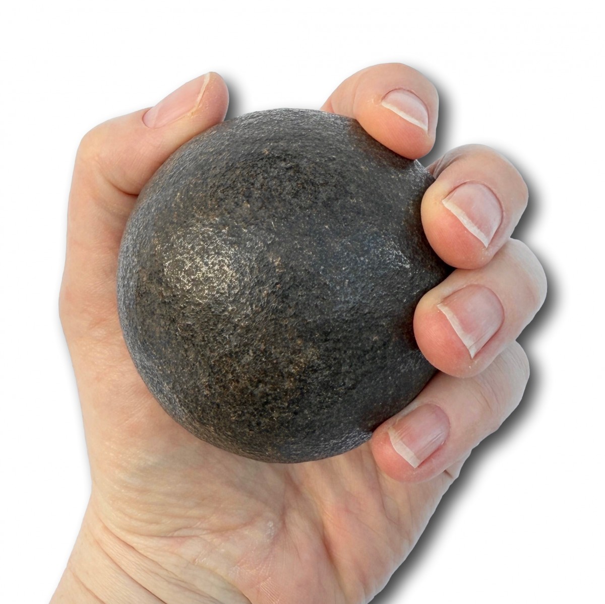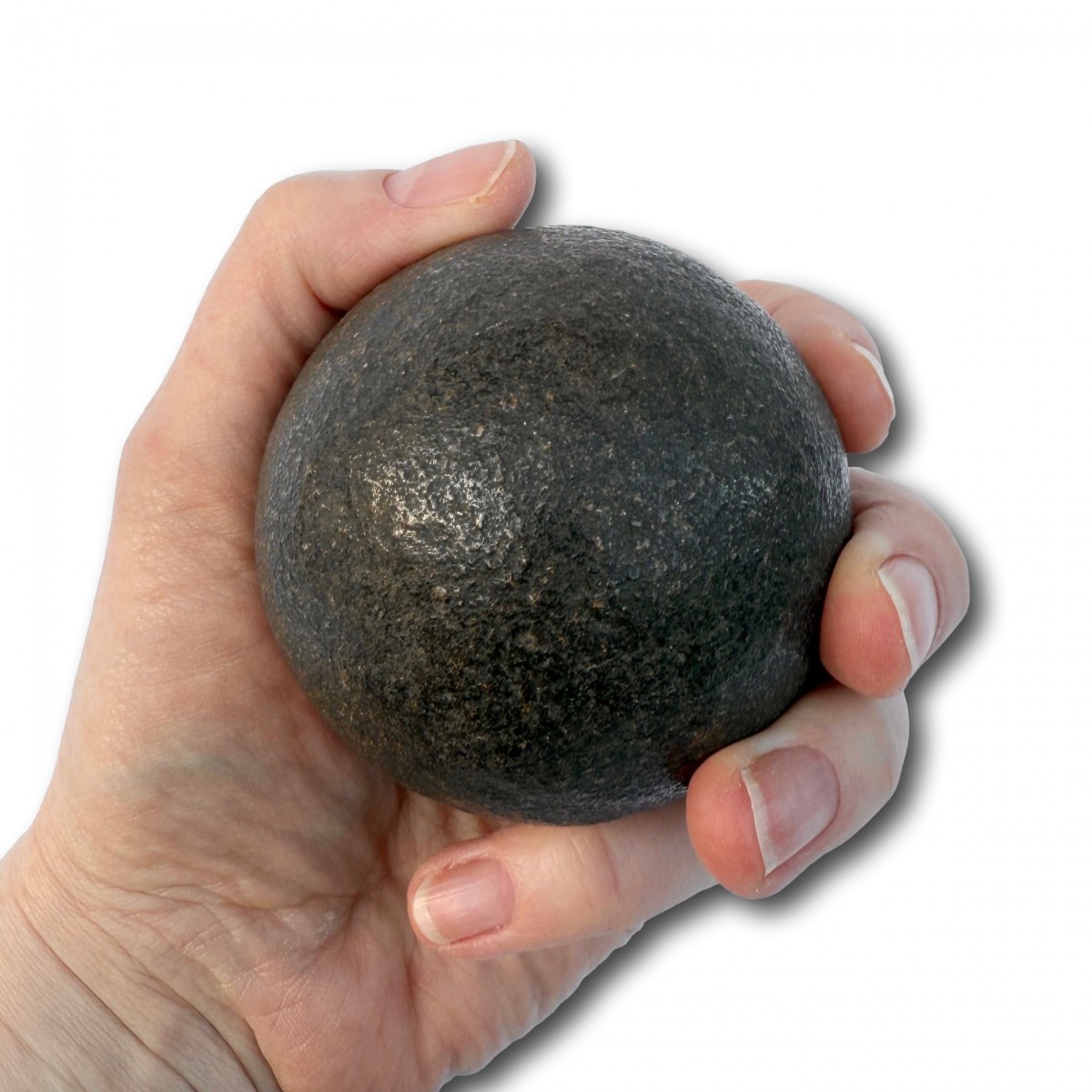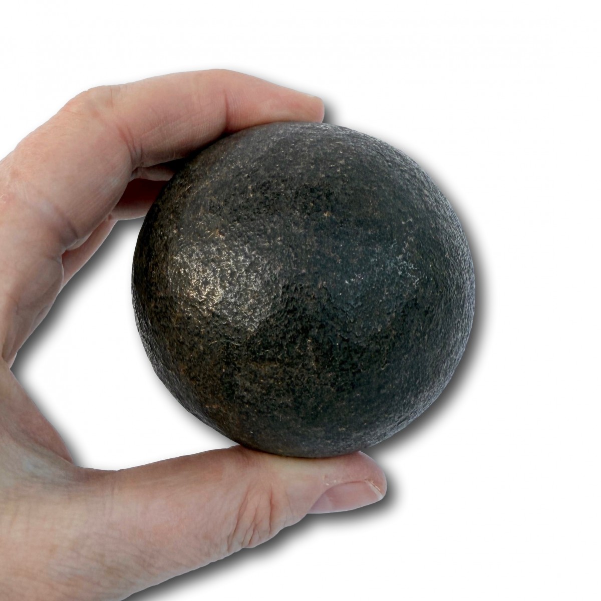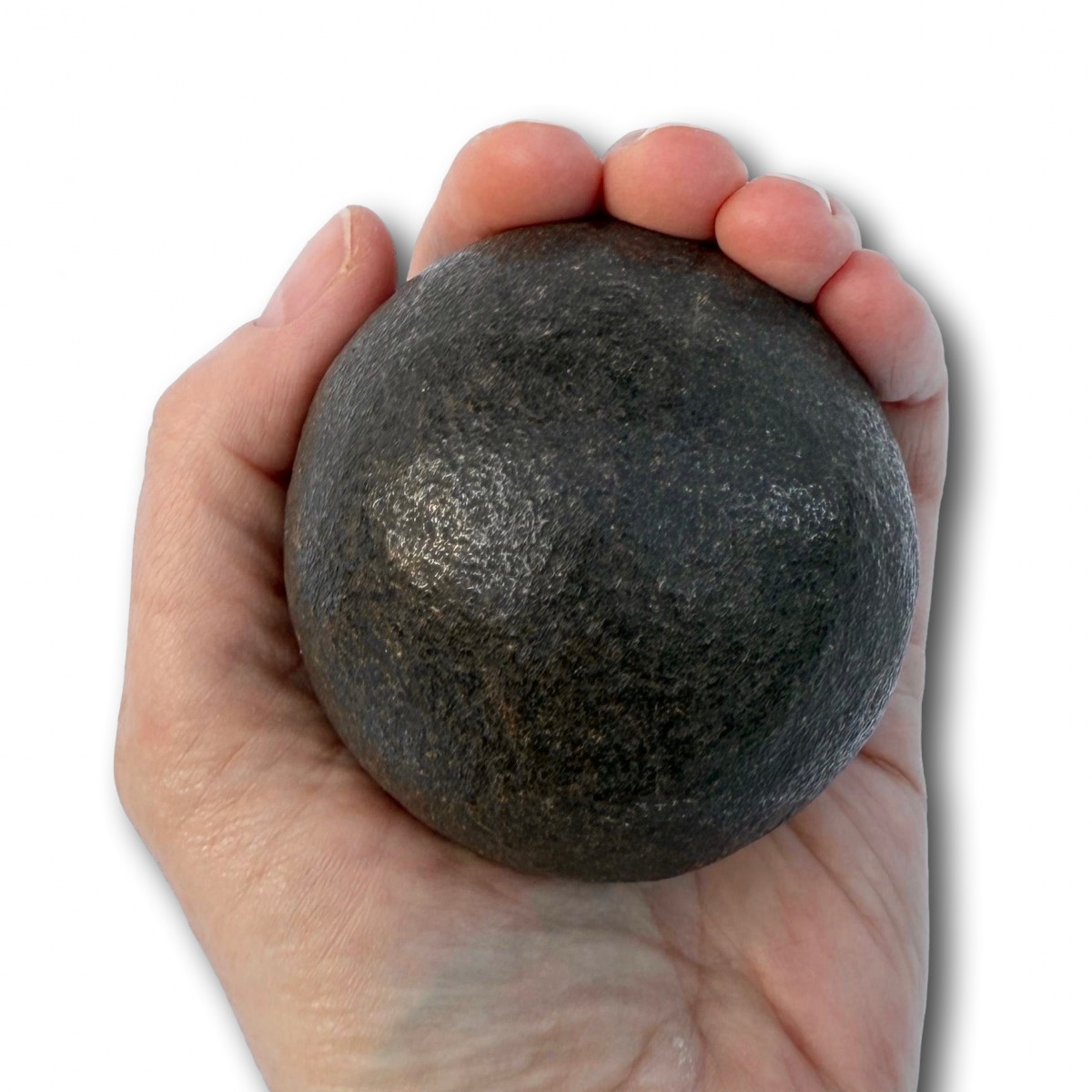 A substantial bezoar stone of rounded form, its surface displaying the characteristic granular, mottled texture produced by successive accretions within the stomach of a ruminant animal, most commonly a goat or camel. The sphere has a dense, dark, mineralised exterior, with subtle natural variations in tone and lustre that reflect its organic formation. It is presented on a turned ebonised wooden stand, shaped with a stepped foot to offer stable and elegant support.