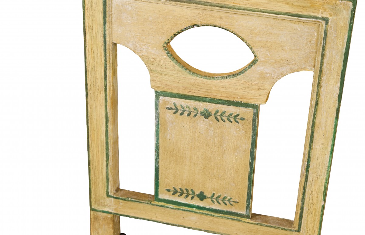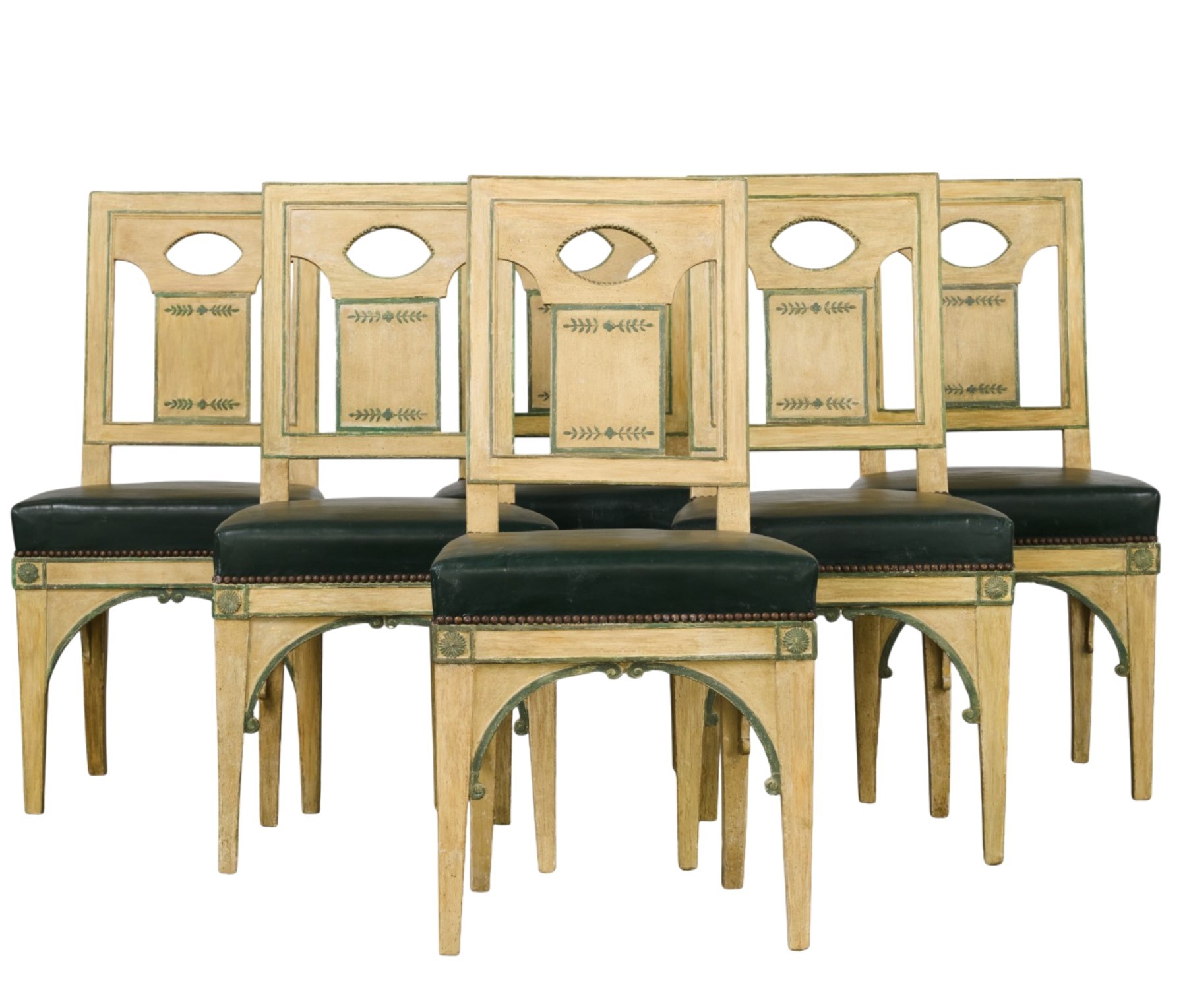 The rectangular straight backs are openwork on the sides and in the center of an oval medallion, decorated with a central panel featuring stylized green foliage branches, framed by a green border.