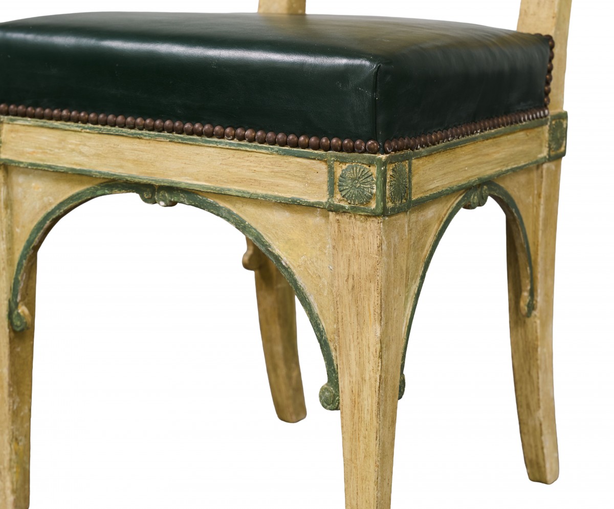 The seats, with antique green studded leather upholstery, rest on a molded belt decorated with green rosettes, in connecting dice. They are supported by front legs with arched spandrels ending in rounded ends and rear legs in saber style.
