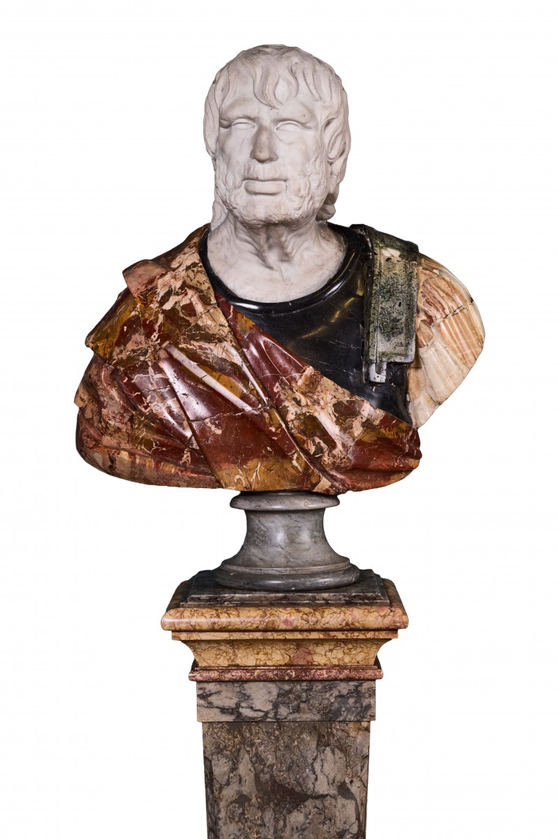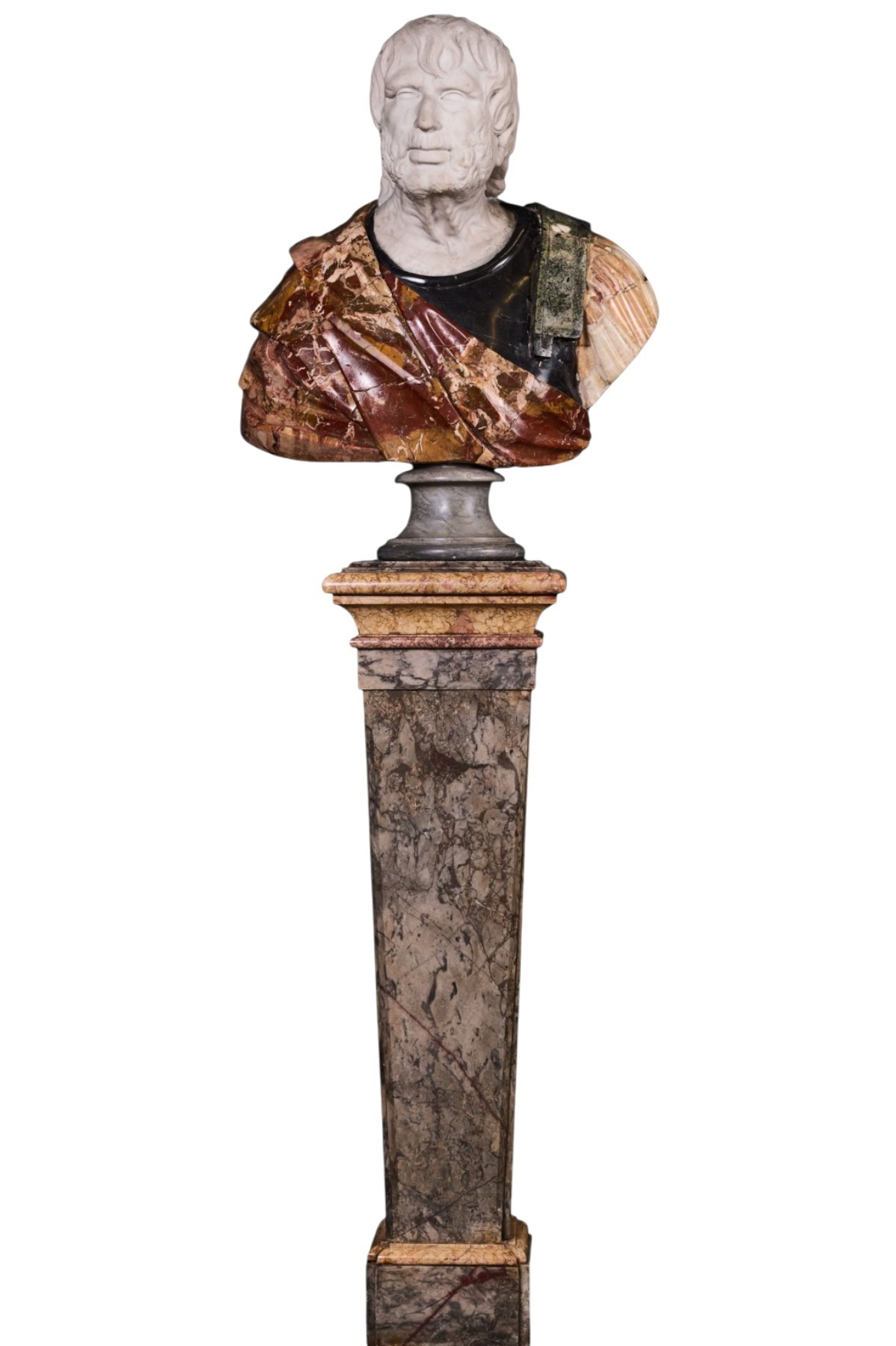 To contrast with the face, carved from white Carrara marble, he is dressed in a garment carved from different colored marbles: black Portor, Giallo Antico, red breccia, and antique green blend together in a sumptuous play of contrasts. This refinement in the choice of materials reflects the Baroque taste for rich materials and the sculptor's virtuoso workmanship.