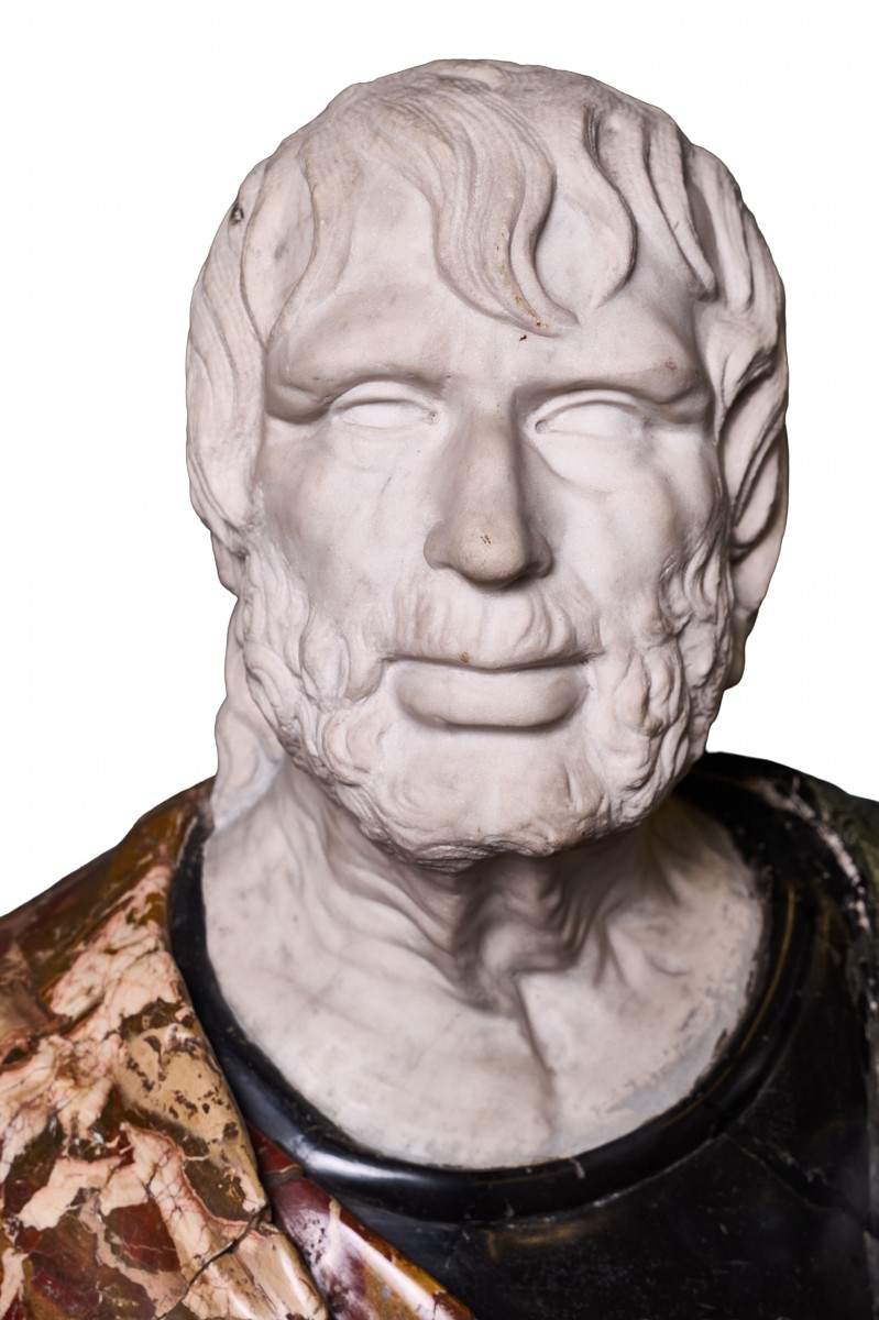 Polychrome marble bust representing Seneca, Roman Stoic philosopher. The bust is a beautiful 17th-century work, made of different polychrome marbles. The workmanship is meticulous and contrasts with the pure white head.