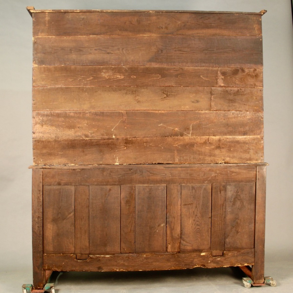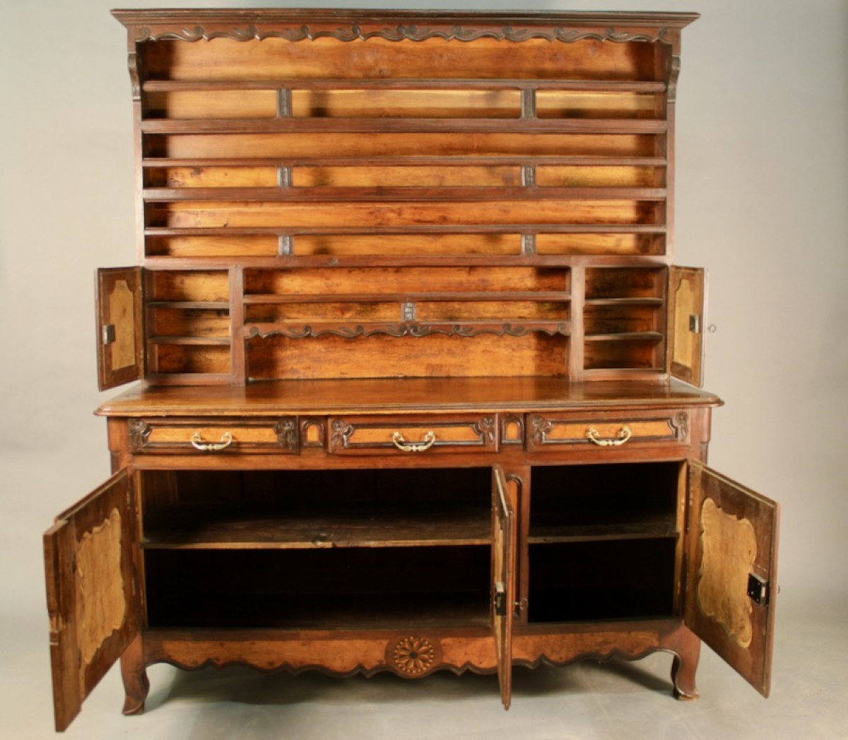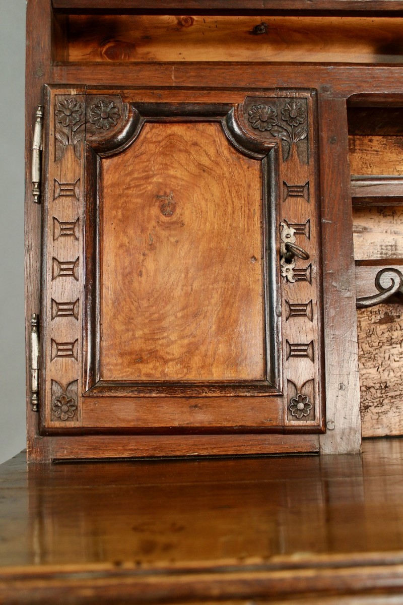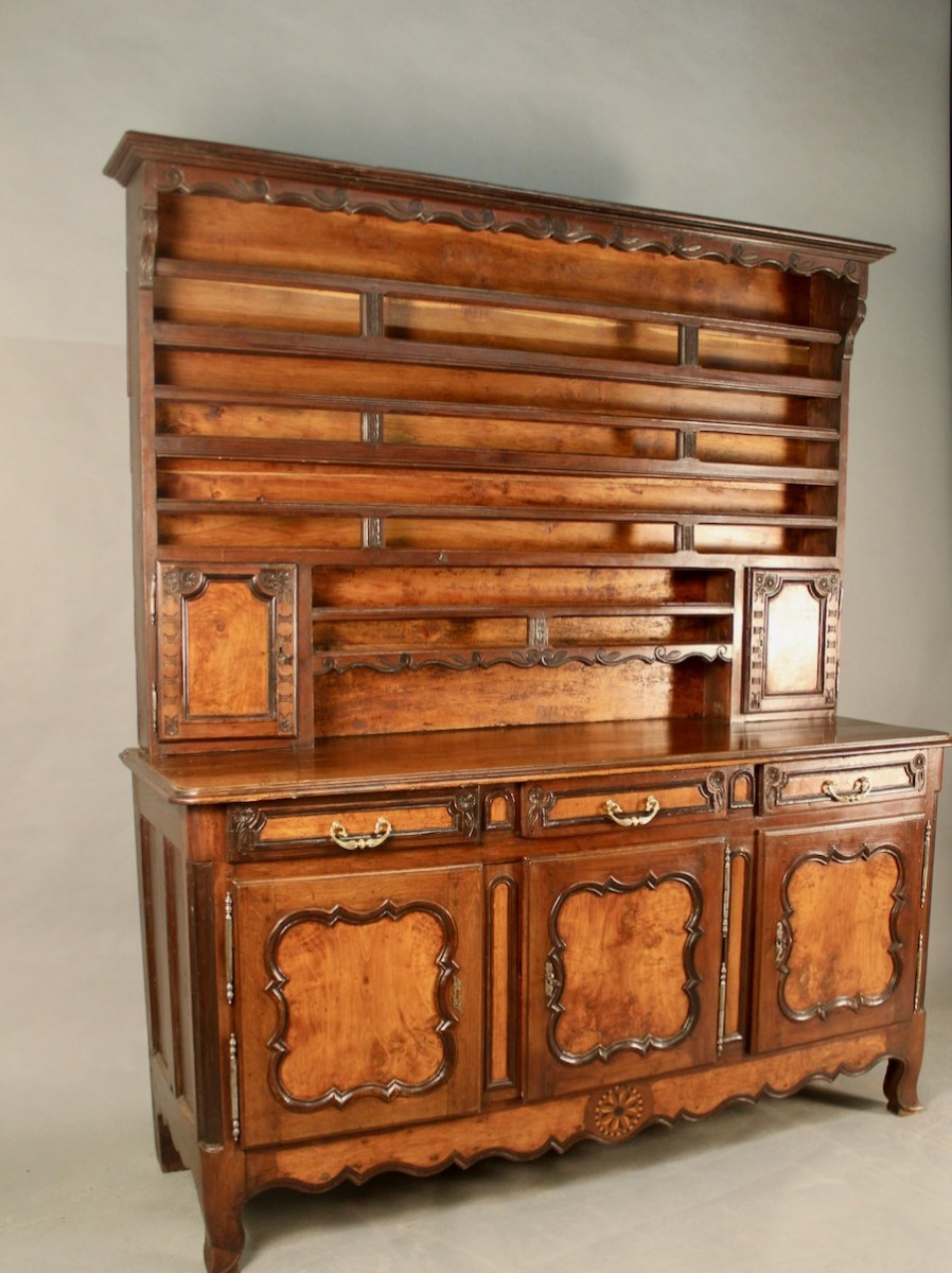 A two-part oak and ash burl sideboard, dating from the early 19th century, in the Louis XV style. A Bresse-style piece. True to the Bresse tradition, this sideboard combines burl wood with oak framing. The lower section opens with three doors surmounted by three drawers. The doors are richly molded. Attractive marquetry adorns the lower rail. The upper cornice is molded and carved with a garland of foliage. Two small doors provide additional storage in the upper section. Dimensions: Length (cm) 183 Width (cm) 59 Height (cm) 213