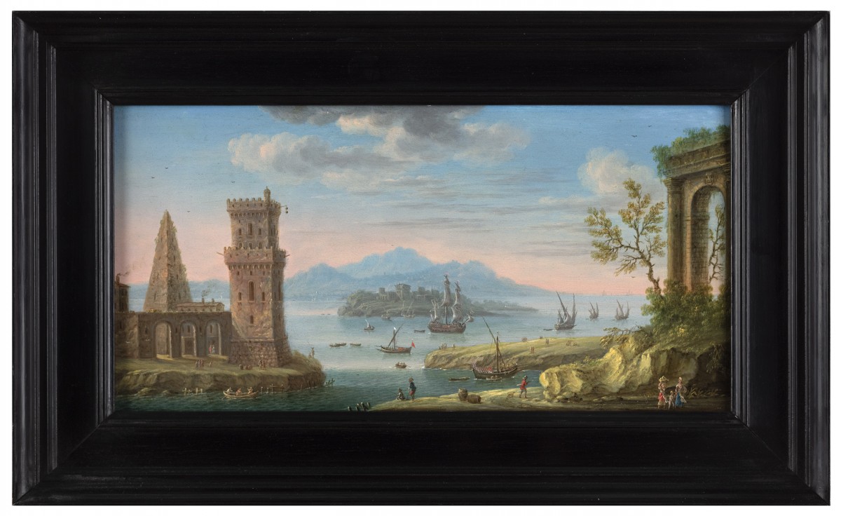 Grevenbroeck is best known for his capricci—imaginary landscapes and harbor scenes populated by towers, ruins, and figures that evoke both the spirit of antiquity and the dynamism of the Baroque age. Active primarily in Naples, he moved within a circle of artists such as Niccolò Casissa, Antonio Joli, and Leonardo Coccorante, who specialized in similar picturesque and theatrical compositions. His choice of copper as a support further aligns him with the Flemish miniature tradition, allowing for meticulous precision and a jewel-like brilliance in color.
