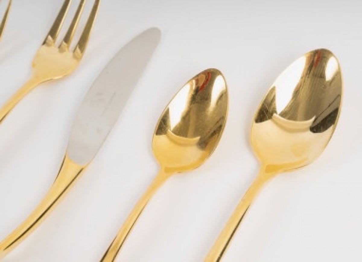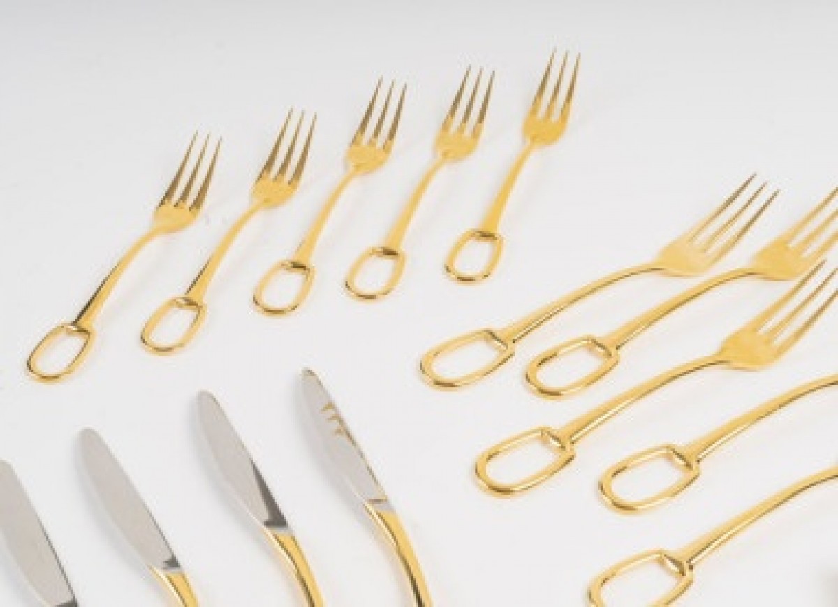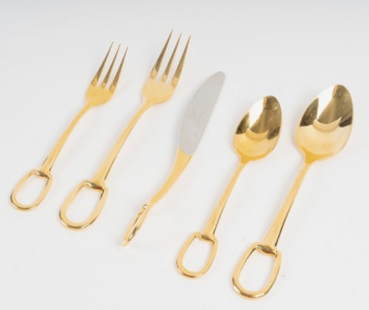 Gold-plated dessert set comprising 25 pieces. With its original shape and grip, the Grand Attelage set is inspired by the saddle key, a piece used in multi-horse carriages. This gold-plated collection consists of cutlery: tableware and dessert cutlery. 5 table forks 20 cm 5 table spoons 19.5 cm 5 gold-plated metal dessert forks, 17 cm 5 dessert spoons, 16.5 cm 5 dessert knives, 19.5 cm Set of 6 available 6 table forks, 20 cm 6 table spoons, 19.5 cm 6 gold-plated metal dessert forks, 17 cm 6 dessert spoons 16.5 cm 5 dessert knives with only 5 dessert knives €5,750 Replacement available from Hermès at €500 per knife. Made in France Designed by Philippe Mouquet Translated with DeepL.com (free version)