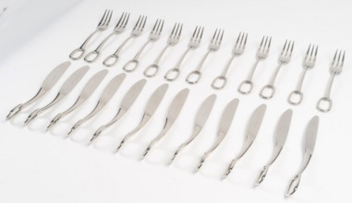 Original in both form and grip, the Grand Attelage service is inspired by the saddle key, a piece used in multi-horse carriages. This silver-plated series includes: - 12 table forks, 20 cm - 12 table knives, 22.5 cm Made in France Designed by Philippe Mouquet
