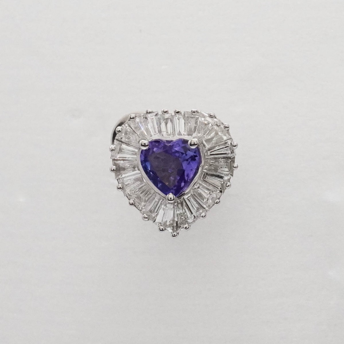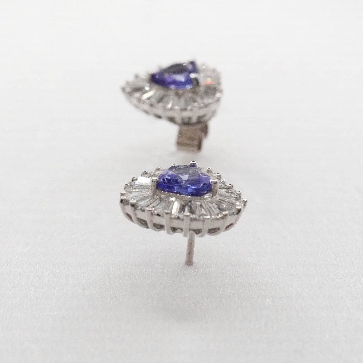 Earrings adorned in the center with a heart-shaped Tanzanite, weighing 1.20 carats, surrounded by 40 baguette-cut diamonds, weighing 1.40 carats.