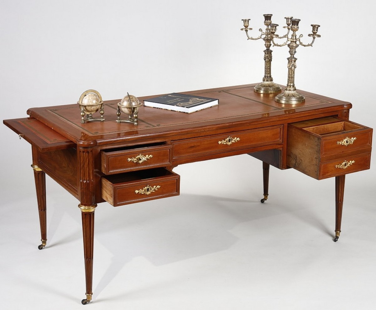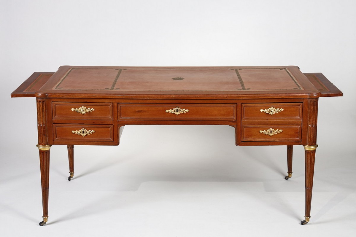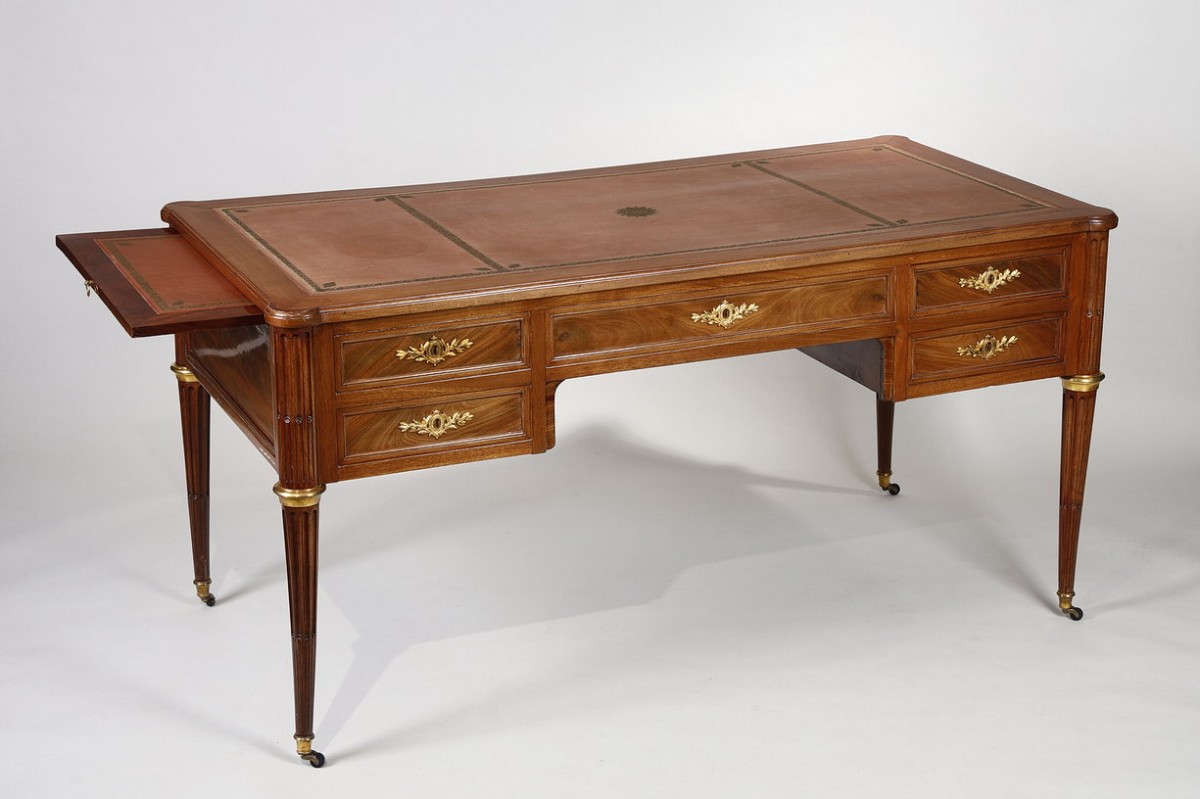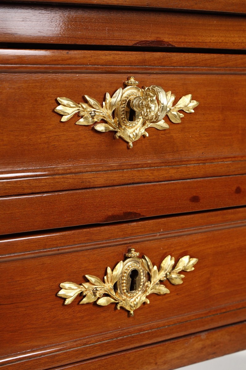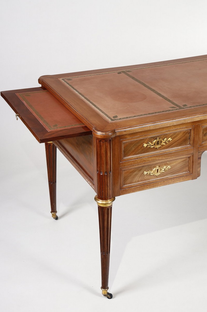 The gilt bronze ornamentation is concentrated solely on the rings, sabots, and lock escutcheons. The latter, decorated with finely chiseled intertwined laurel leaves, encircled by a pearl medallion, bring a touch of prestigious elegance to this desk.