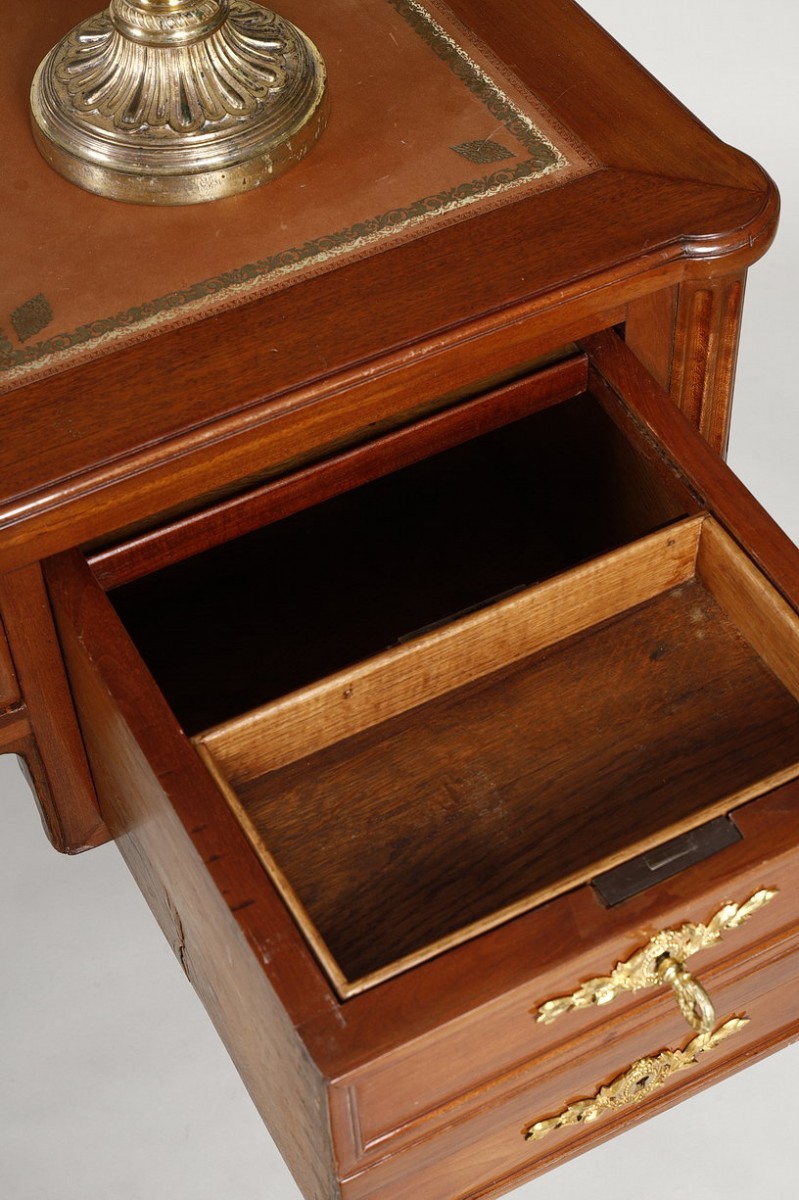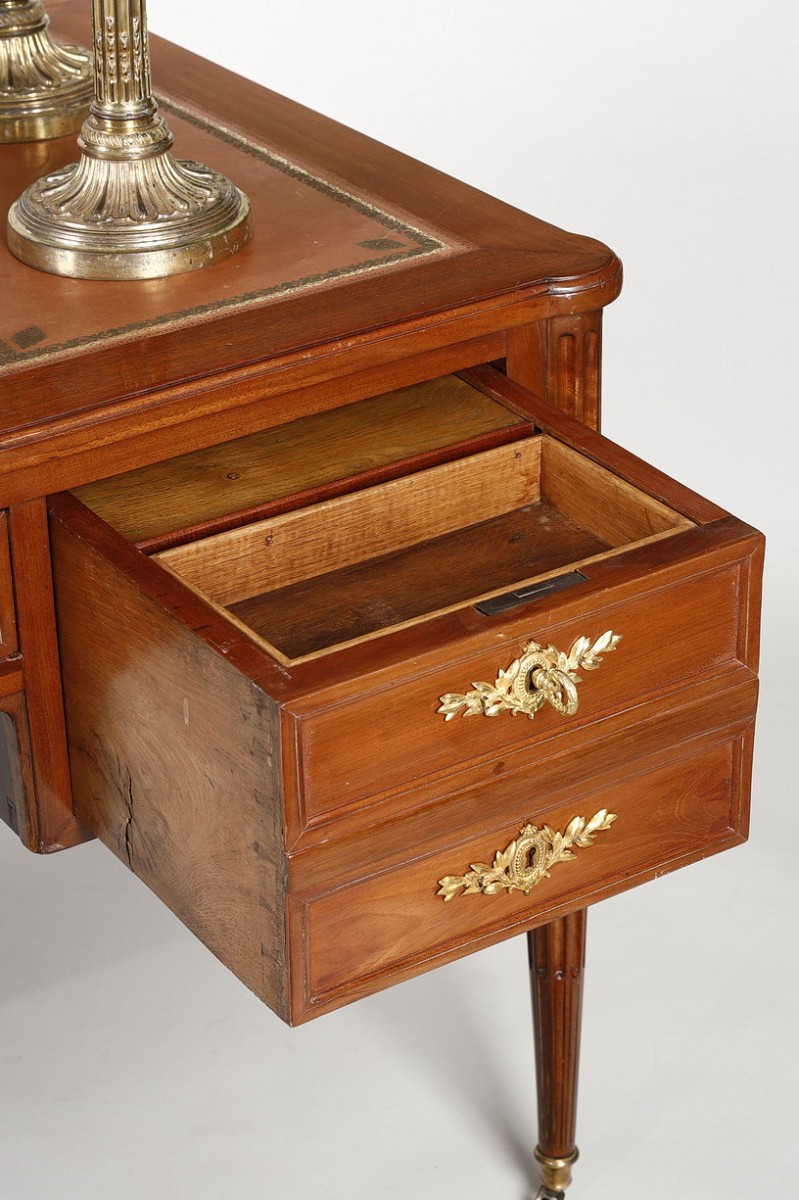 Made of solid mahogany and mahogany veneer, this desk features five drawers in three rows. Its back is decorated with simulated drawers, and each side is ingeniously furnished with pulls upholstered in Havana leather gilded with a small iron.