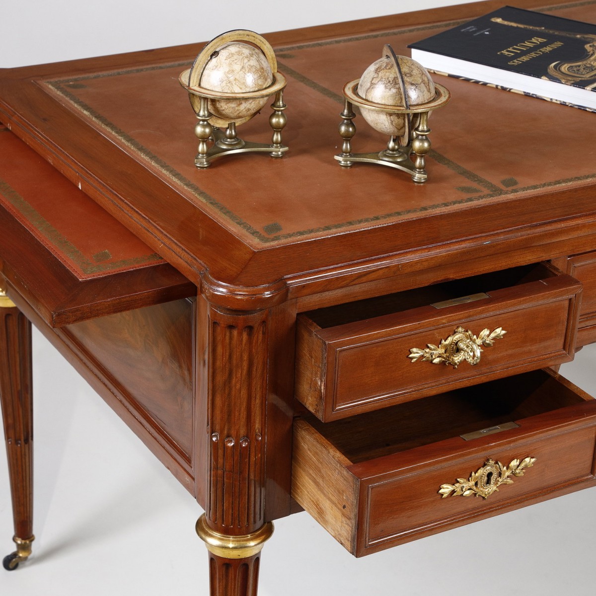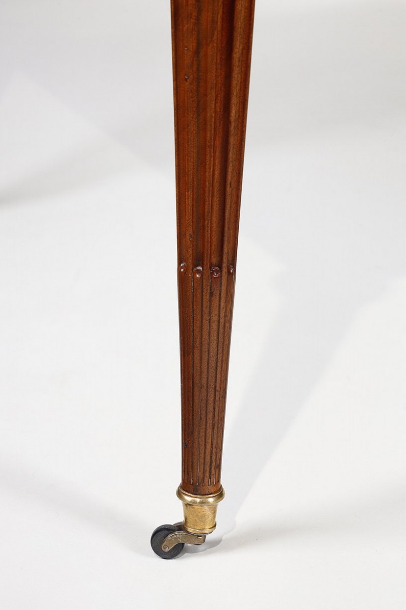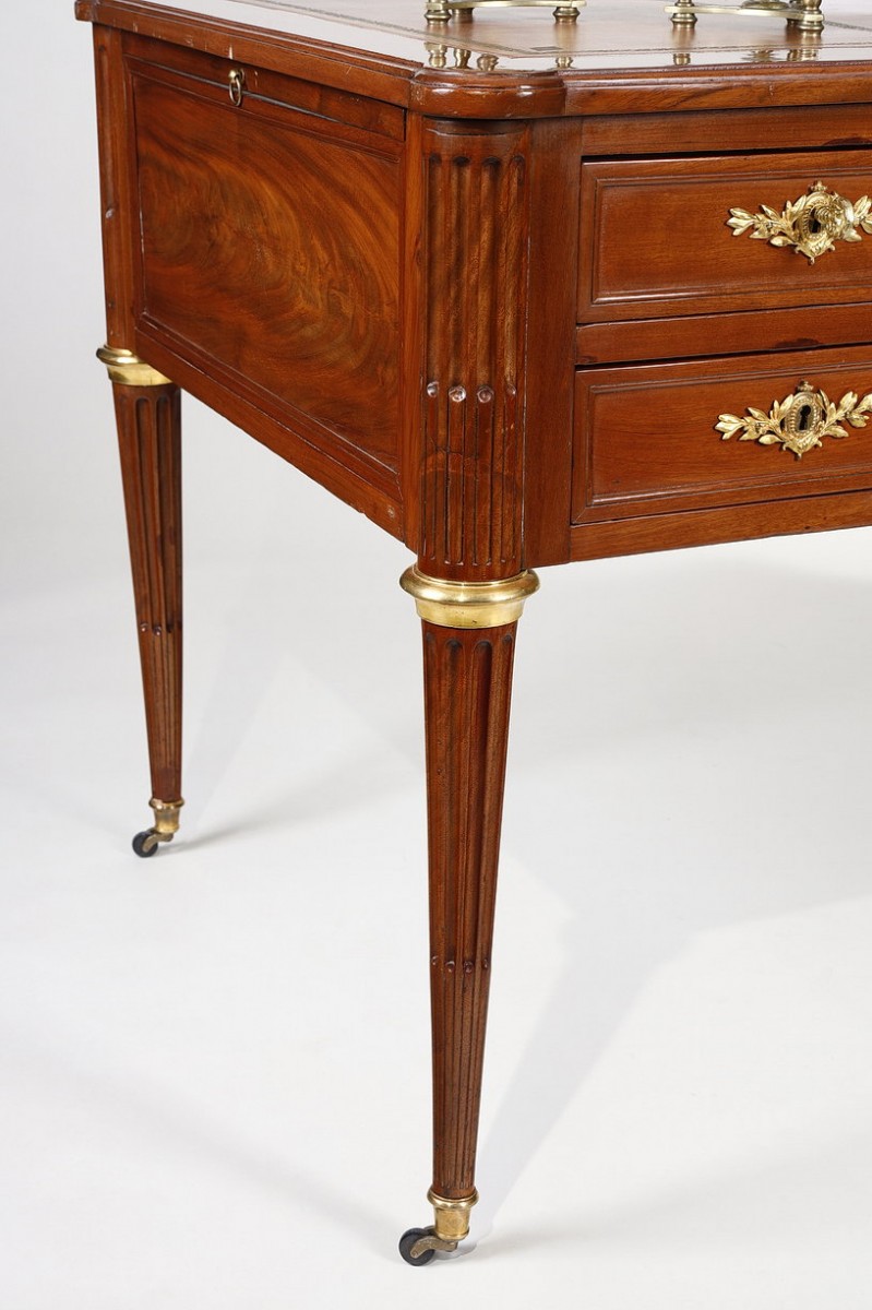 This desk, with fluted uprights, rests on four fluted legs, adorned with gilt bronze rings and shoes, finished with fine casters.