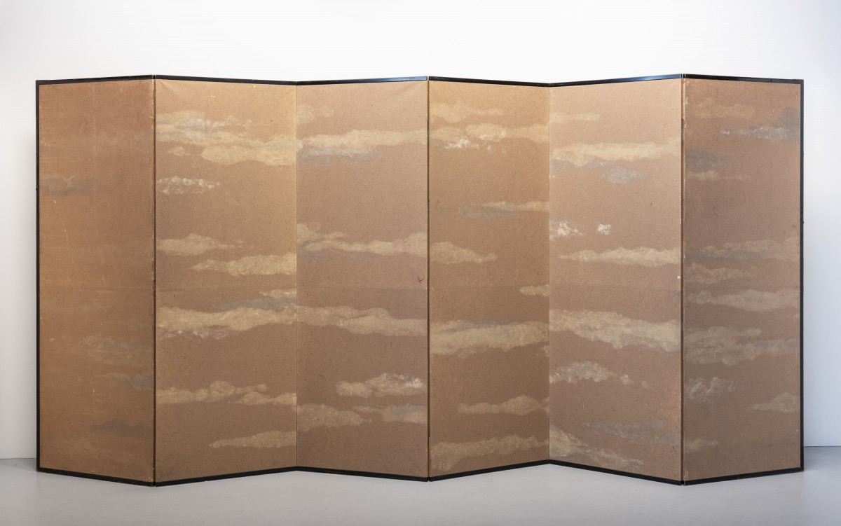 A Japanese six-panel screen painted on paper, depicting Mount Fuji emerging from the clouds, its snow-covered peak set in a soft, atmospheric haze. On the right, dark pines appear faintly, dissolving into the mist.