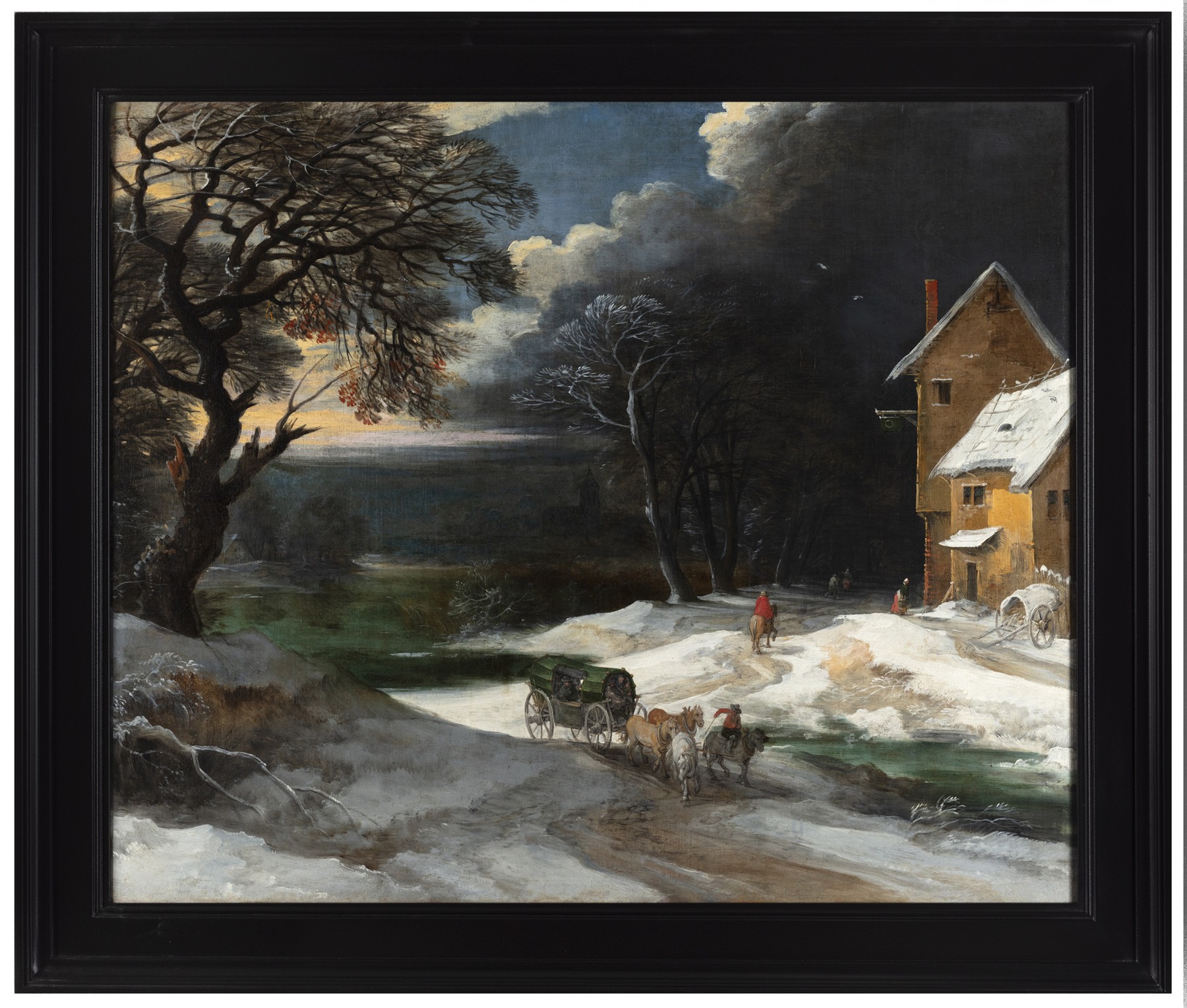 De Momper’s brushwork combines precision with atmosphere: the silvery tonality of the snow contrasts with the deep browns and greys of the trees, while subtle gradations of light evoke the transitory calm between storm and dusk. The artist’s mastery lies in his ability to convey both spatial depth and emotional quietude, transforming a simple moment of rural life into a poetic reflection on the passage of time.