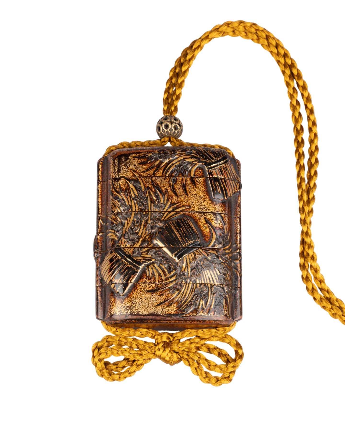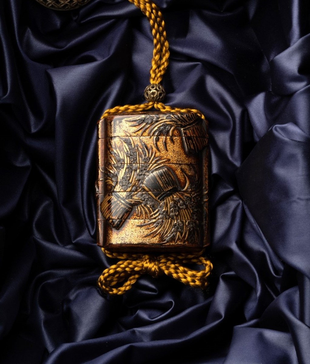 A rare inro opening by four cases and a lit, decorated with urushi lacquer of Nashiji nuri lacquer, with black and gold lacquer depicting sheaves of rice. Original inlays now lost. With his original Ojime. Louis Gonse Collection, no. 348. Japon Edo 17th century