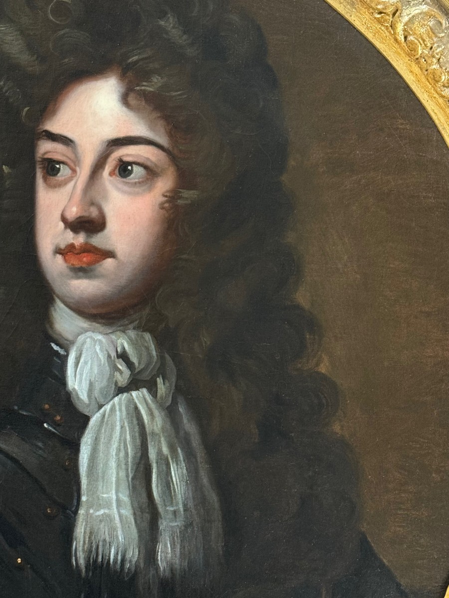 Fine quality and sensitively rendered 17th century English portrait of Algernon Capel, 2nd Earl of Essex (1670-1710) from the studio of Sir Godfrey Kneller (1646 - 1723). The handsome sitter is depicted half length in armour with a white stock and full wig.