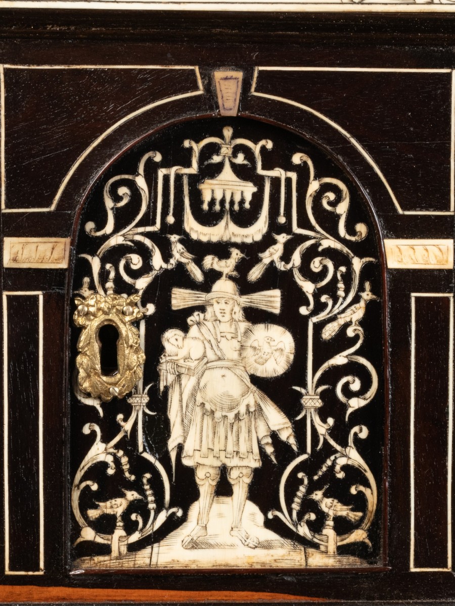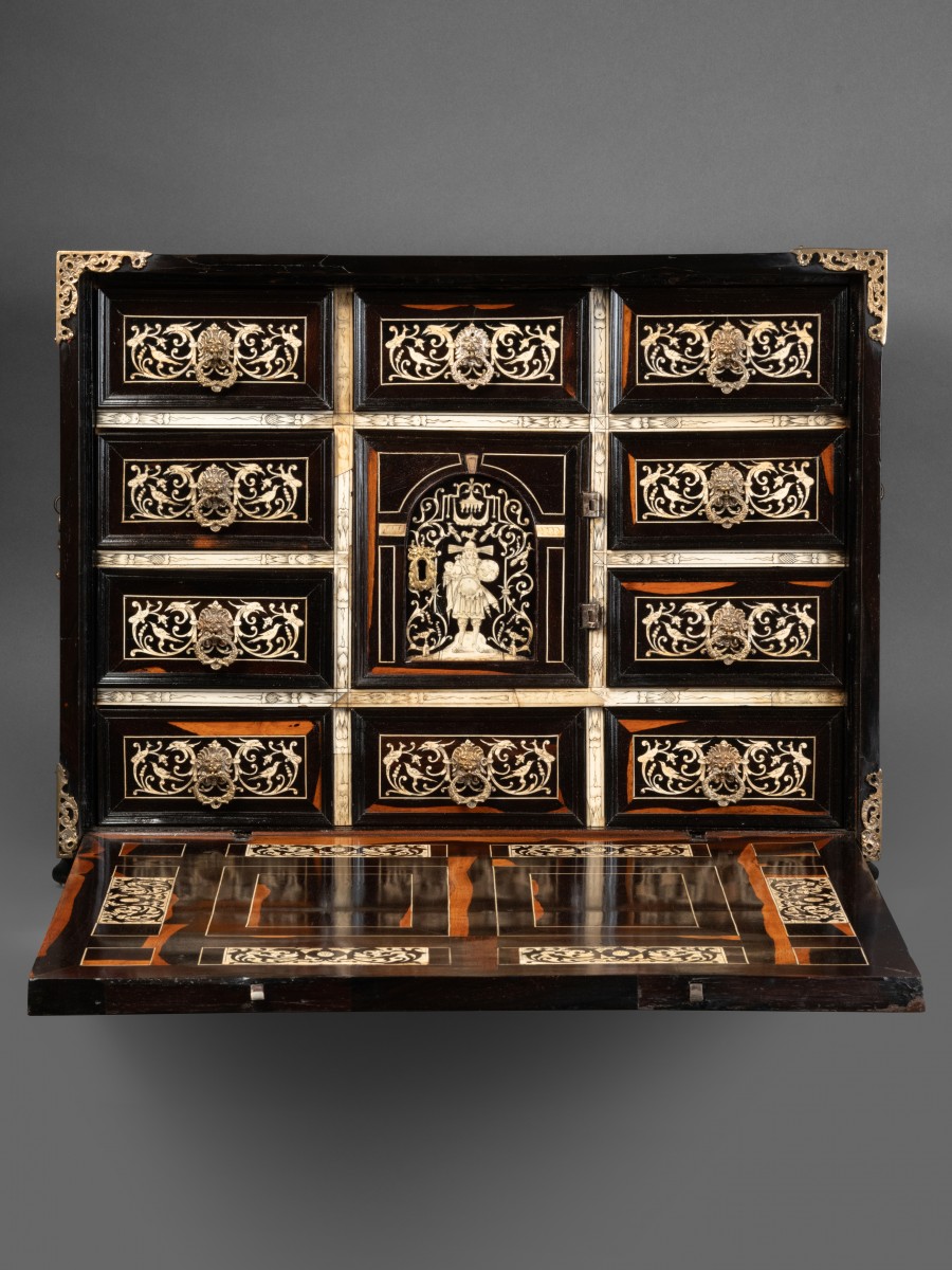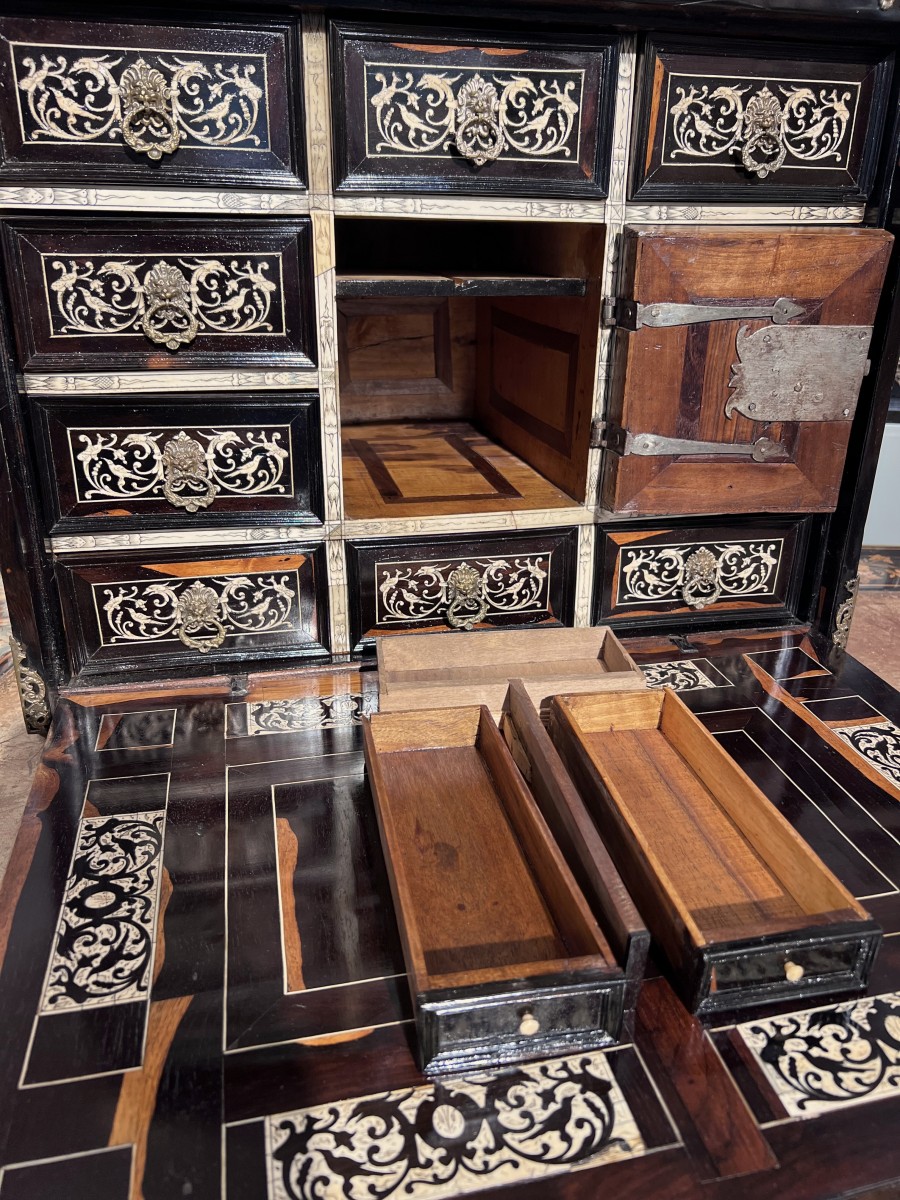 The exterior of the fall front receives a careful decoration of arabesques, volutes, flowers, stylized birds in ebony on an ivory background. The large central bone plaque illustrates a mythological scene.