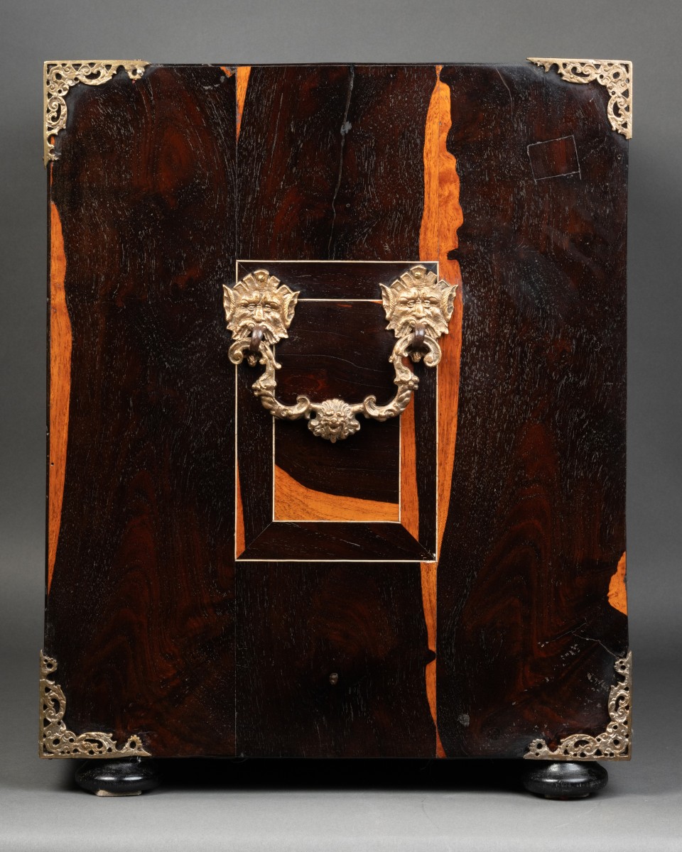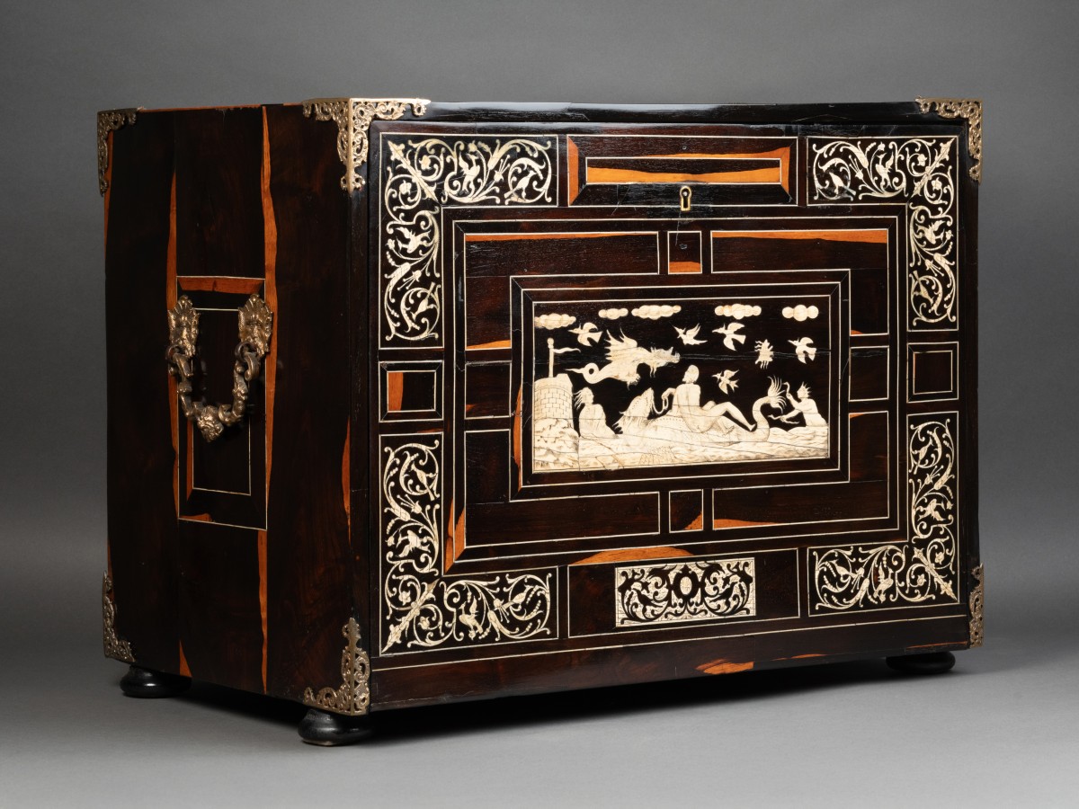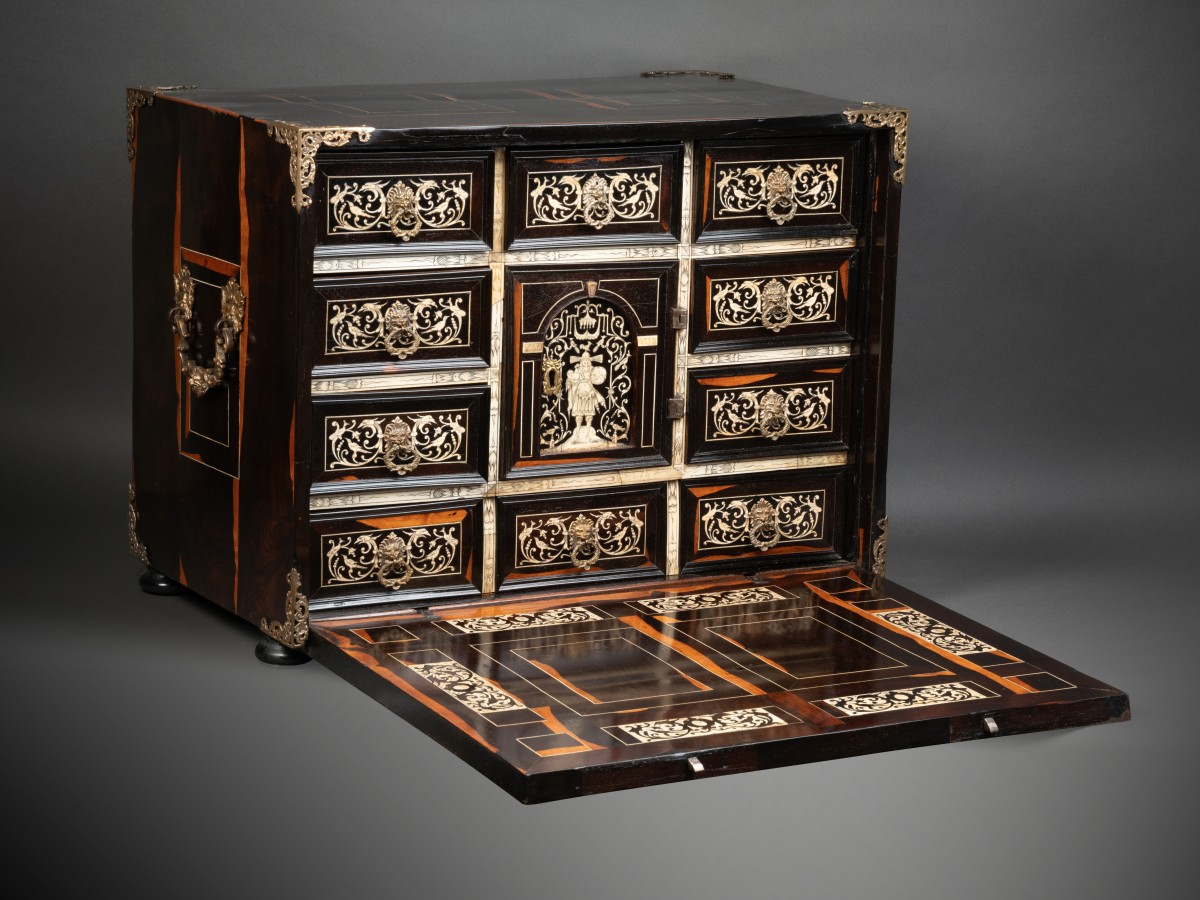 The exterior of the fall front receives a careful decoration of arabesques, volutes, flowers, stylized birds in ebony on an ivory background. The large central bone plaque illustrates a mythological scene.
