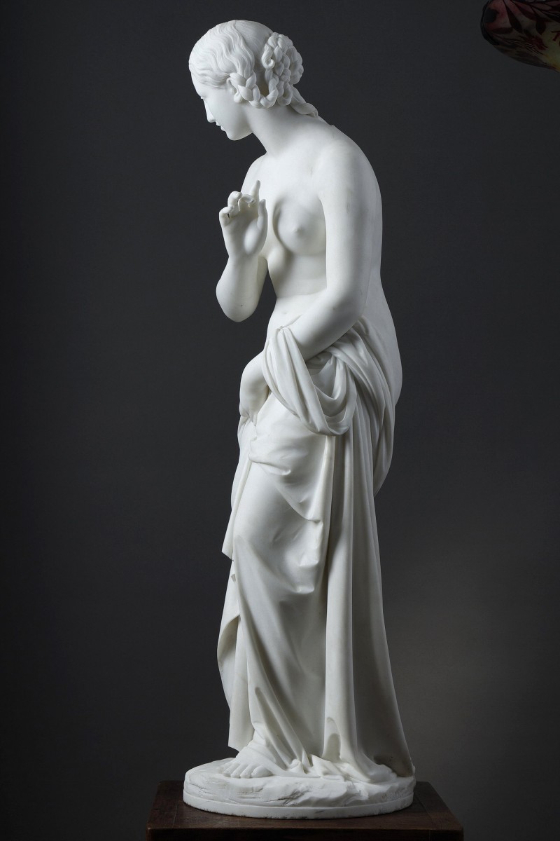 In 1858, Odoardo Fantacchiotti, developing his art towards a classicism aimed at exalting beauty and grace, evoking the great Italian masters Antonio Canova and Lorenzo Bartolini, completed the three most important works of his career: "Eve tempted by the serpent", our "Musidora" and the funerary monument of Luisa Teresa Renard, wife of the painter William Blundel Spence (Fiesole). These works were successful at the Italian Exhibition in Florence in 1861, then at the Universal Exhibitions in London in 1862 and Paris in 1867. They earned him the medal of merit in 1861 and the cross of merit from the King of Portugal in 1867.