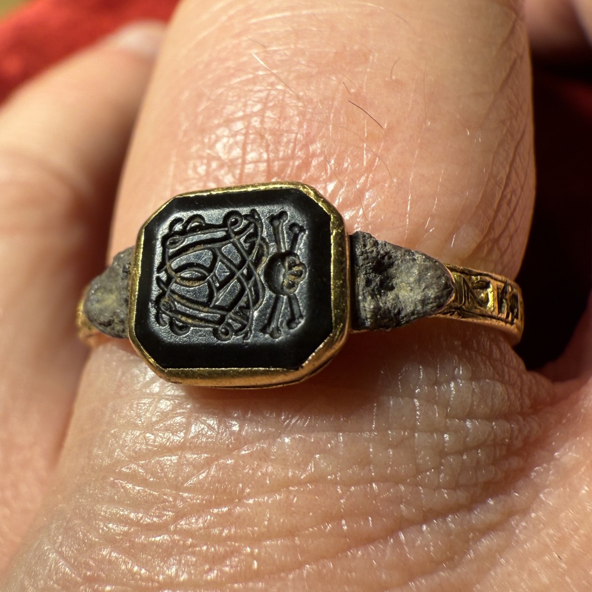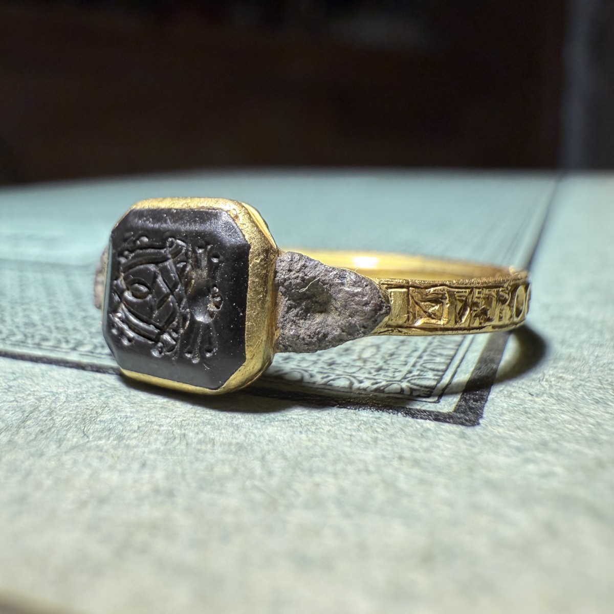 The silver settings on either side of the bezel are distorted and without their original stones or enamel. Localised scorching and deformation indicate that the ring was exposed to intense heat at some point, possibly a fire.