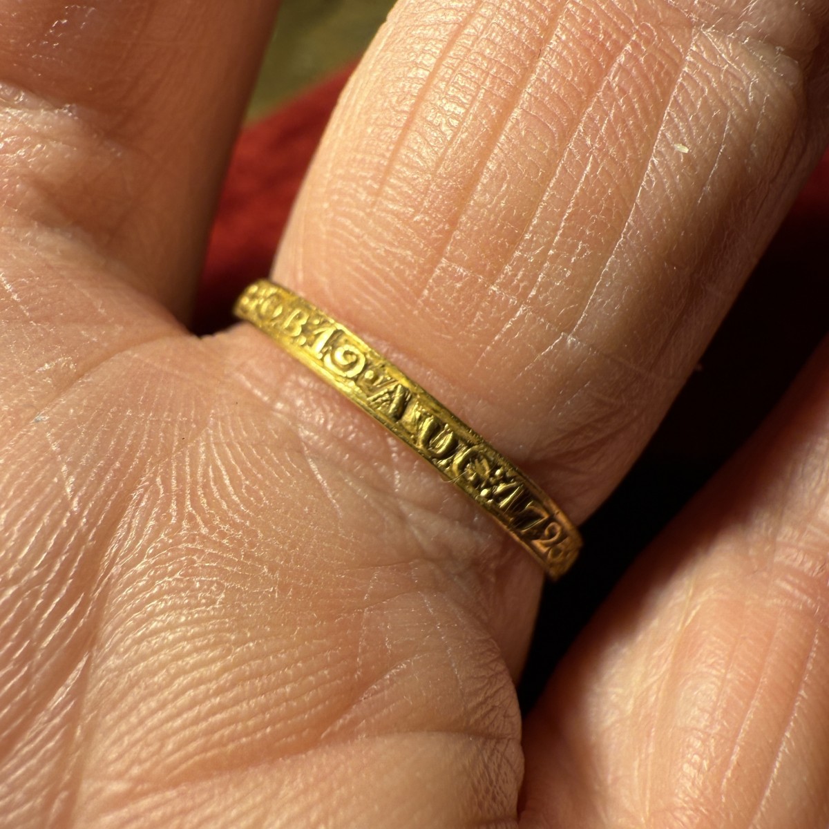 An early eighteenth-century gold mourning ring with a D-shaped band engraved on the exterior: L:ROGERS.OB:19.AUG:1725.AET:22. The inscription records the death of an individual aged twenty-two in August 1725. The band retains simple chased ornament.