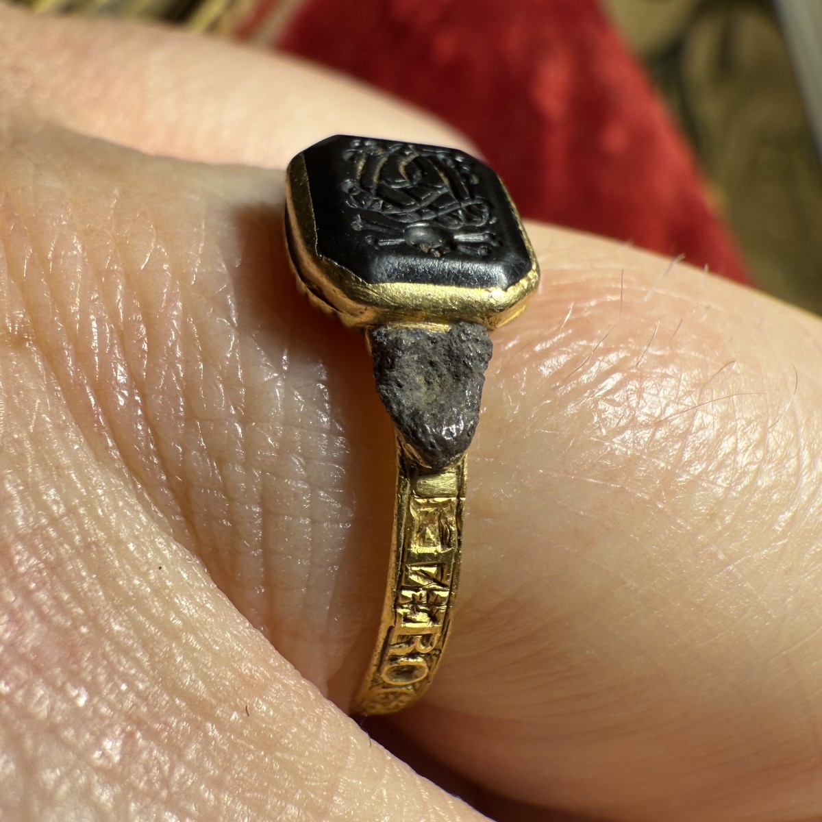 The ring is set with an octagonal onyx intaglio engraved with an interlaced monogram LR accompanied by a skull and crossbones. This combination of initials with a vanitas emblem is characteristic of mourning rings of the period. The bezel is flanked by triangular shoulders retaining deformed silver settings, originally intended to hold small stones—likely diamonds—with traces of former enamel decoration.