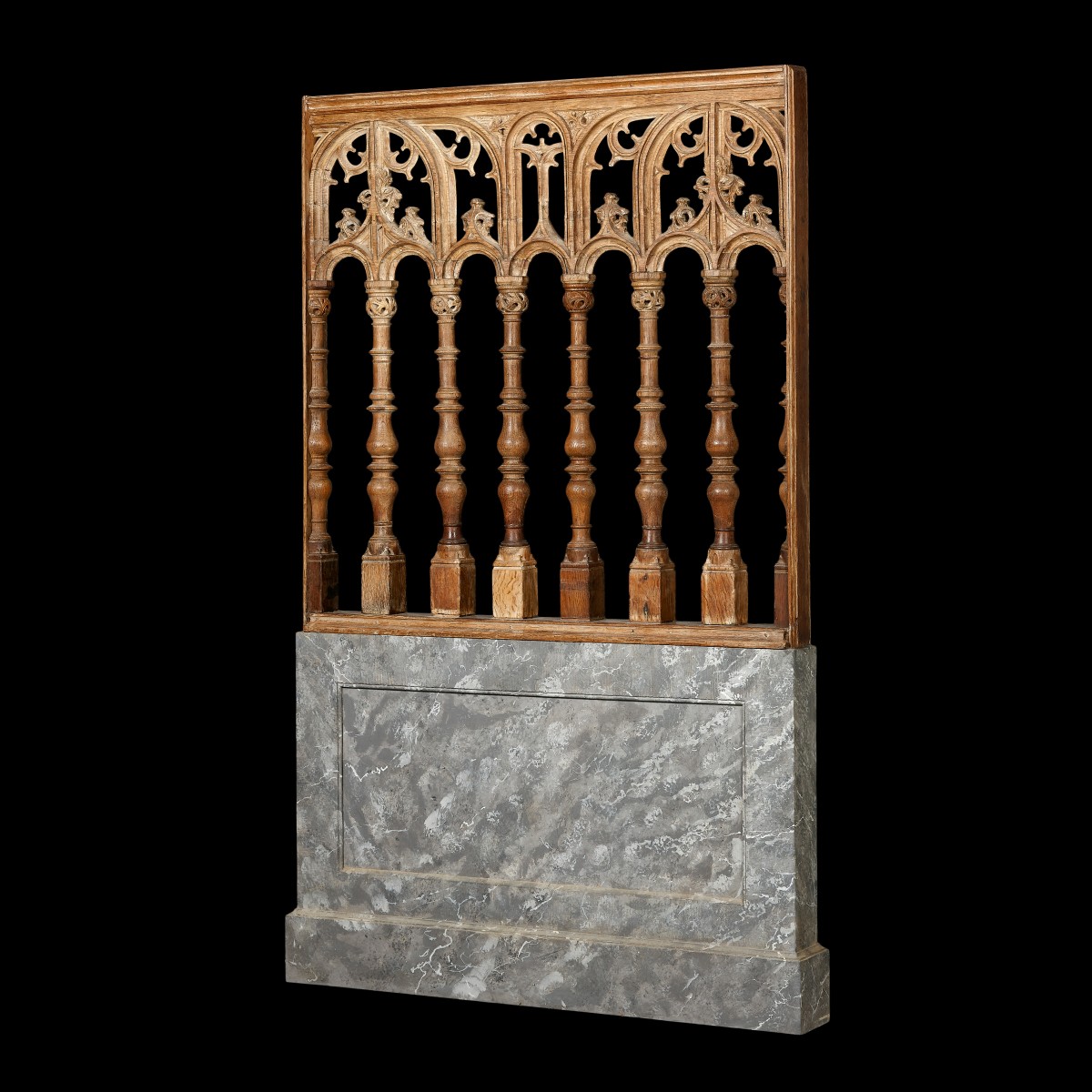 The tracery shows similarities to that of the upper register of the well-know jubé in the basilica Saint-Materne, also know als the Notre-Dame, in Walcourt, Namur (see fig. 1-2). This fine choir screen in pierre d’Avesnes stone, dated about 1531, was presented to the church by Emperor Charles V, at a time when Flanders was ruled by Spain. As such, stylistically the present choir screen can ben situated in the Low Counties, with an origin in the second quarter of the 16th Century, ca. 1530.