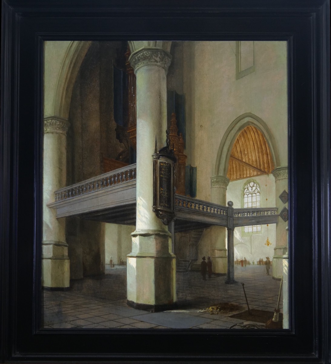Van Vliet explored the present composition in at least three other signed ans dated pictures, e.g. View of the tribune in front of the organ in the Oude Kerk in Delft, signed and dated ‘158 .’, H. 50,5 cm. W. 46,5 cm., col. Národní Galerie v Praze, Prague, (inv. nr. 0-7921; cat. 1961, nr. 80); a second version signed and ‘1661’, H. 43 cm. W. 35,5 cm., coll. Gemäldegalerie der Akademie der Bildende Künste, Vienna (inv. nr. 687; cat. 1992, nr. 127) and a third version signed and dated ‘H. van Vliet 166 .’, H. 42.8 cm. W. 38.5 cm., ex. coll. Kunsthandlung Julius Böhler, Munich (RKD nr. 118713). This suggests that the present picture also dates from the third quarter of the 17th century, ca. 1655-1665. Maillet furthermore lists a forth unsigned and undated version, H. 35 cm. W. 28,5 cm., anonymous sale Sotheby’s, London, 1972 and a fifth unsigned and undated version on canvas, H. 33 cm. W. 30,5 cm., anonymous sale Habsburg Feldman, Geneva, 1990.