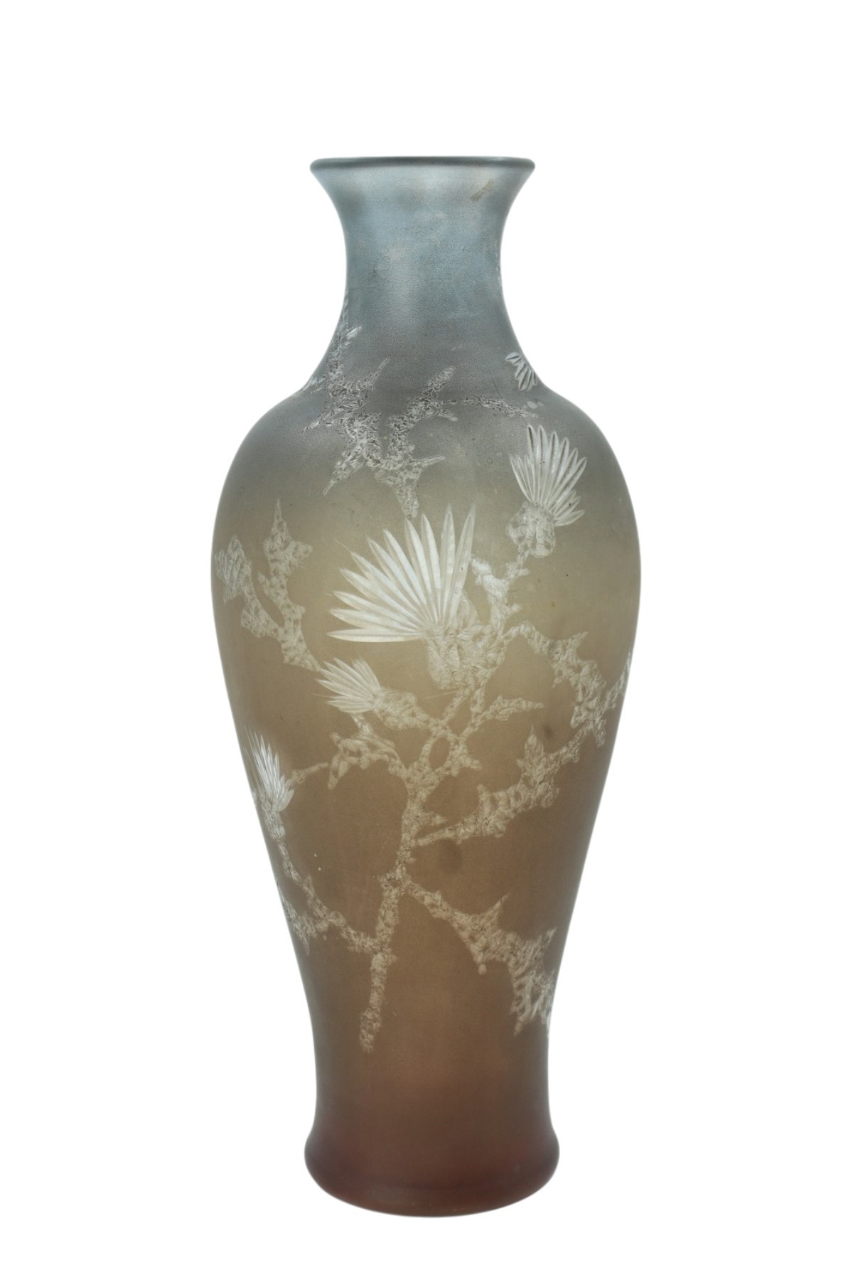 The vase we are presenting here features a subtle gradient from bluish gray at the neck to a warm brown at the base. The decoration, achieved by acid etching and glass cutting, depicts thistles—an emblematic motif of the Art Nouveau movement, of which Habert-Dys was one of the great designers.