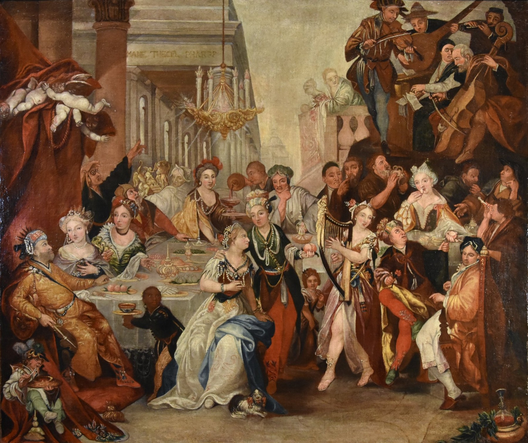 The work, a valuable testimony to the descriptive richness typical of 17th-century Flemish masters, can be attributed in terms of style and compositional choices to the prolific workshop of Frans Francken (Antwerp 1581 - 1642), who loved to revisit biblical themes in his works, particularly the great banquets of history (the wedding of Esther and Ahasuerus, Herod's banquet, Lazarus' banquet...), which offered him the opportunity to give space to his strong narrative propensity.