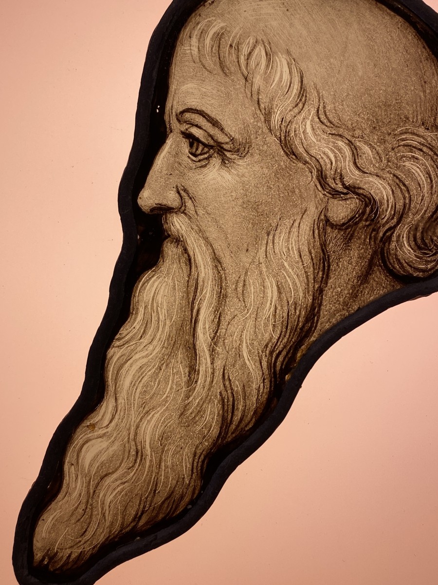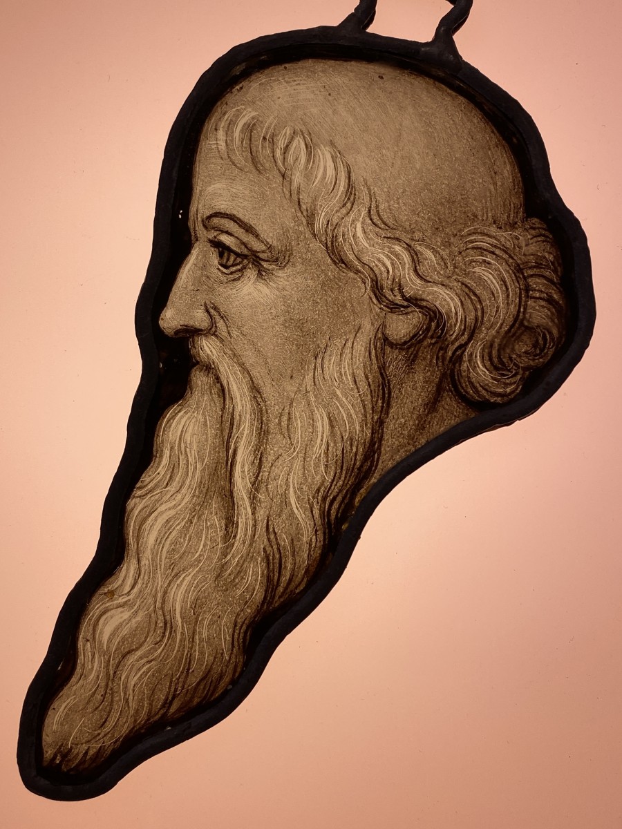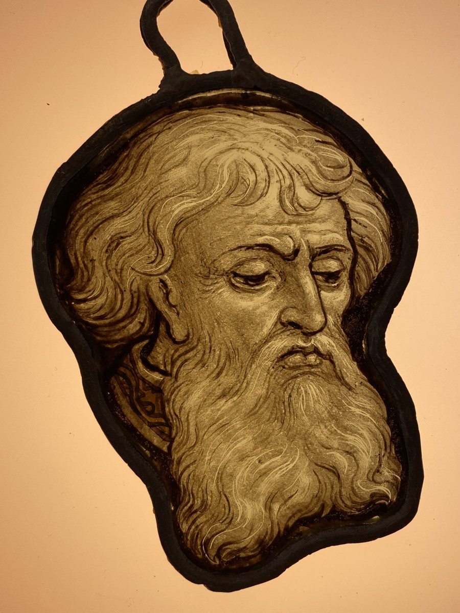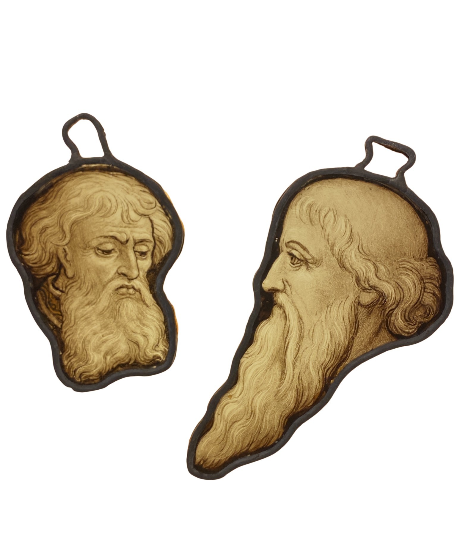 Two stained glass fragments of bearded men, most probably apostles. Glass, grisaille. Very good condition. Lead frames of later date.