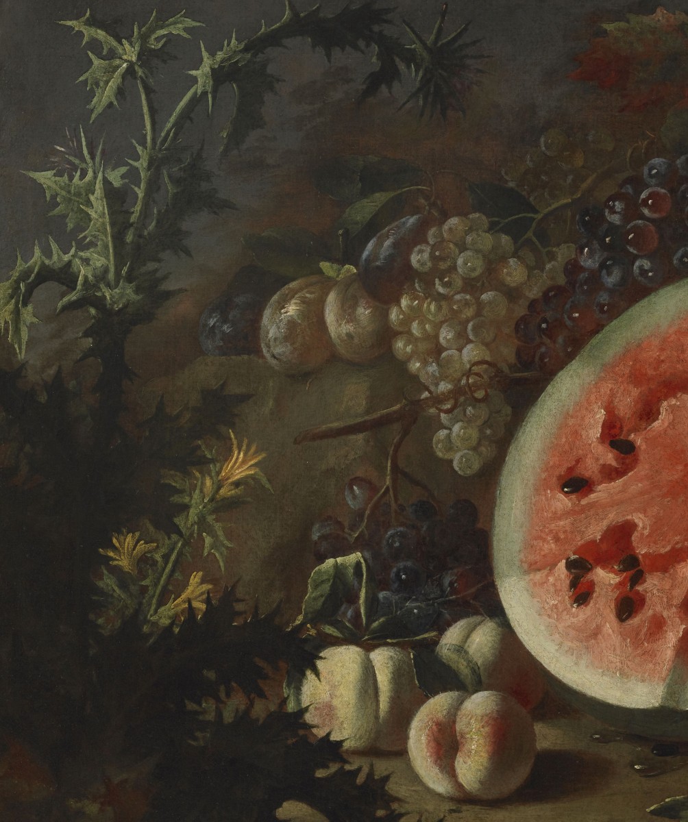 Watermelons, pomegranates, peaches and plums are depicted at the peak of their ripeness, when everything becomes magnificence, light and colour.