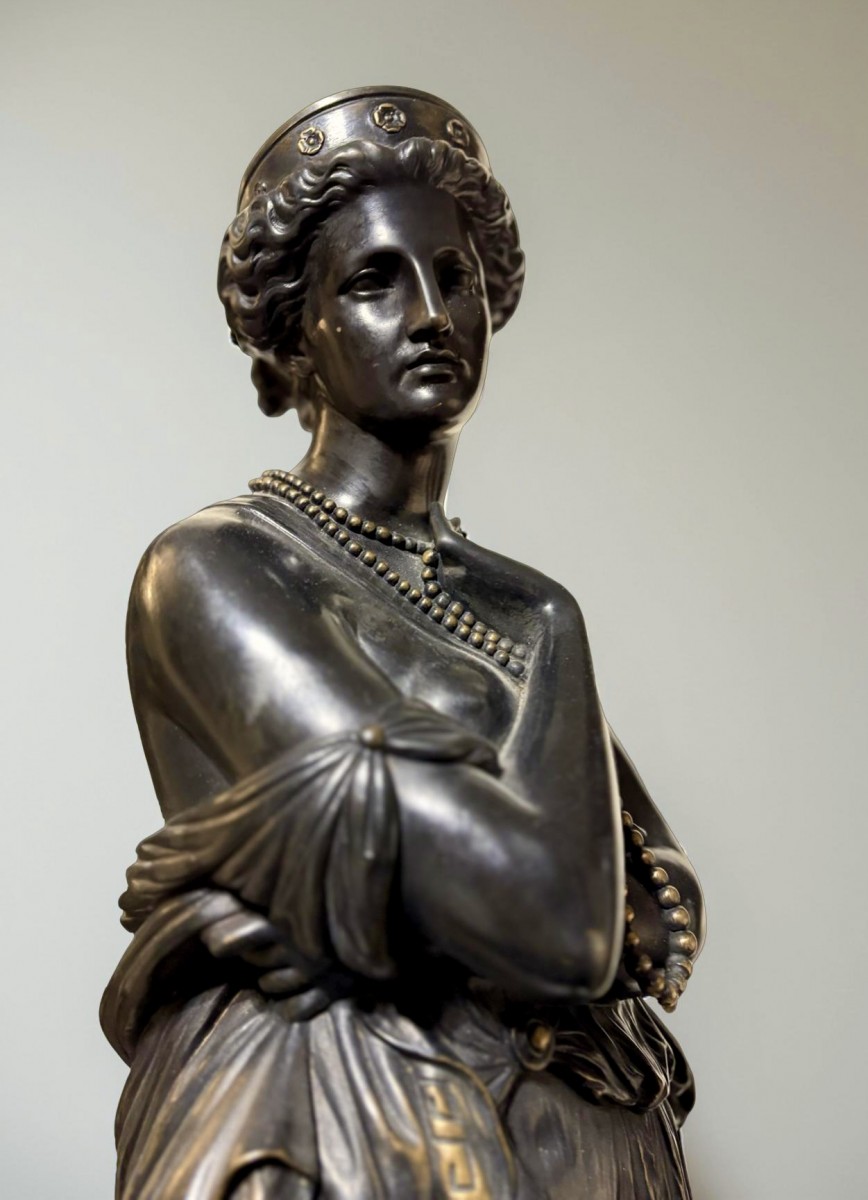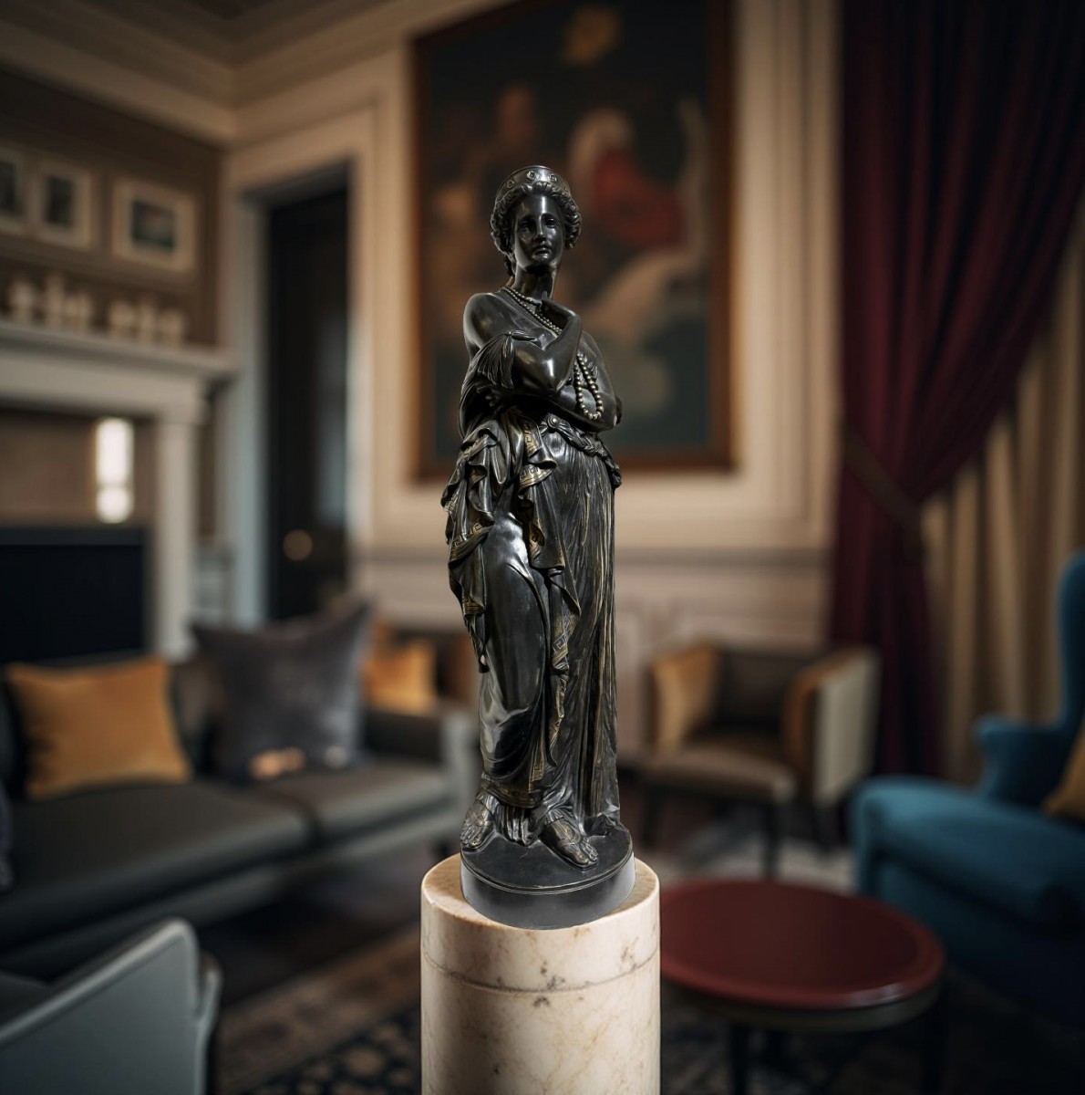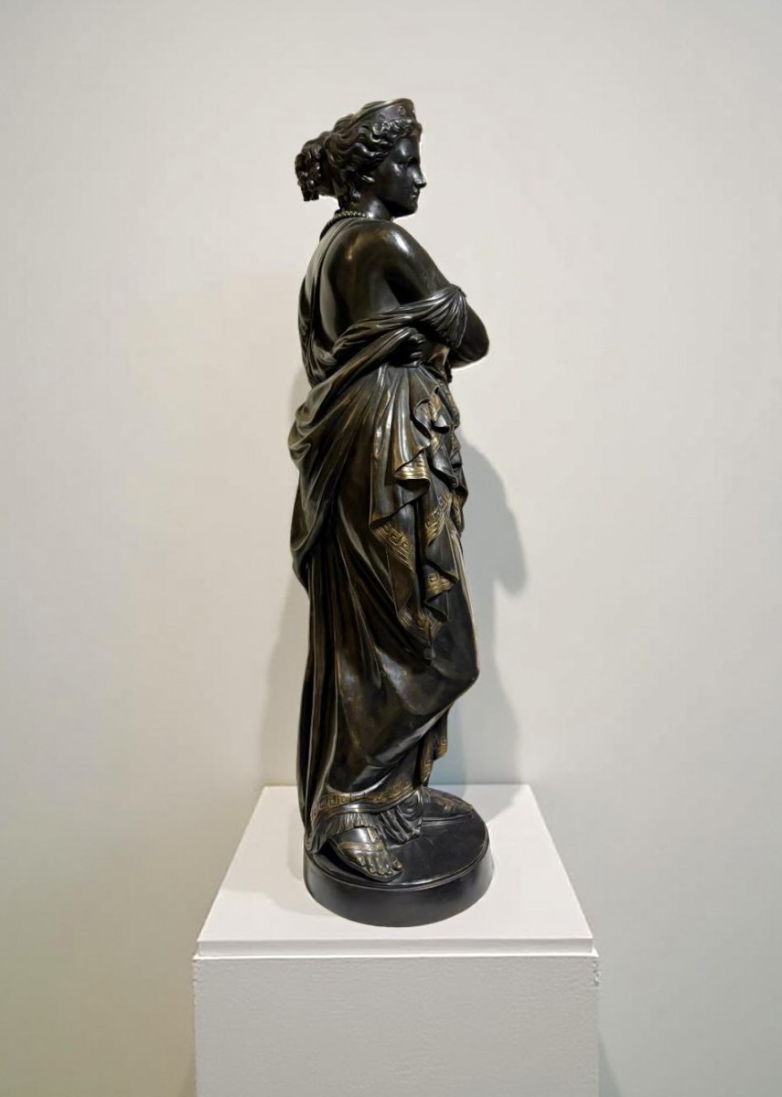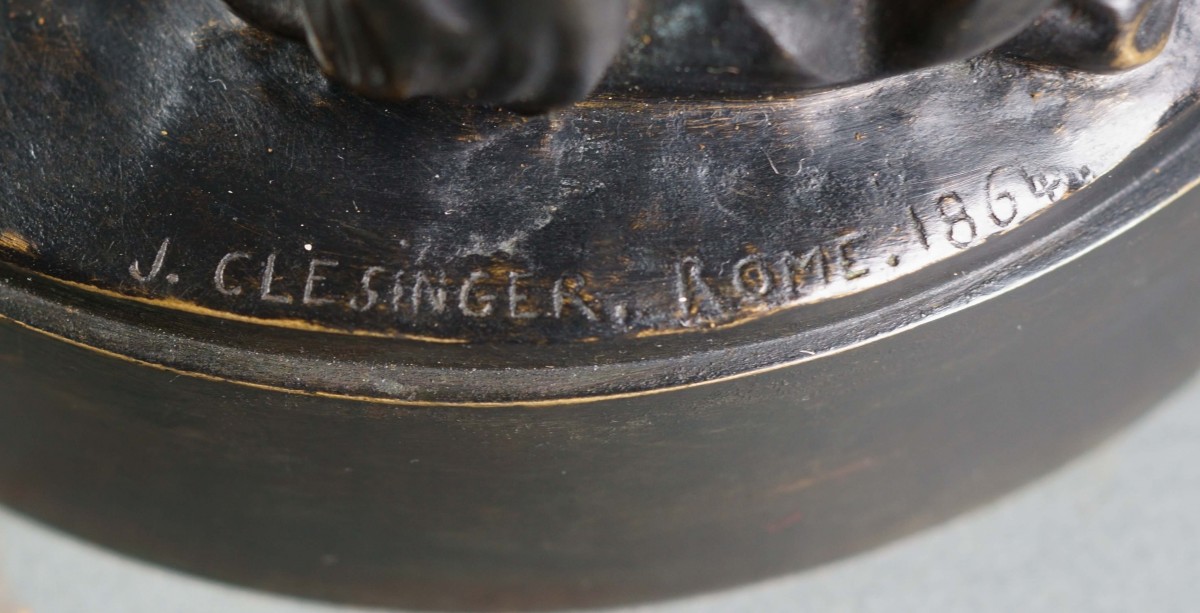 Clésinger made his debut at the Salon of Painting and Sculpture in Paris in 1843 with a Buste du vicomte Jules de Valdahon but became famous with the scandal caused at the Salon of 1847, when he presented his "Woman Stung by a Serpent", today at the Musée d'Orsay. Made from a cast of Apollonie Sabatier, the muse of Charles Baudelaire, then lover of the very rich Belgian industrialist Alfred Mosselman and a great art lover, who had placed the order, this extremely sensual sculpture caused an uproar at the Salon, making Clesinger's name resound everywhere. A controversial, passionate, furious man and sculptor, Clesinger does not accept criticism or advice: he has no students, he is an all-round artist. Strong, energetic, independent, he throws himself on the block of marble and creates his masterpieces, too bold and modern for his time. Irritated by France, he leaves Paris for Rome, where he opens an atelier that he will continue until 1864. His production is never predictable or banal: he tries his hand at busts and historical groups as well as beautiful statues of classical heroines, often played by his favorite muse, the actress Rachel Felix. He is not a sculptor of large numbers, working alone his works are often unique and, when replicated by himself, they always remain in limited numbers. Even the bronze production, published exclusively by Ferdinand Barbedienne, is limited.