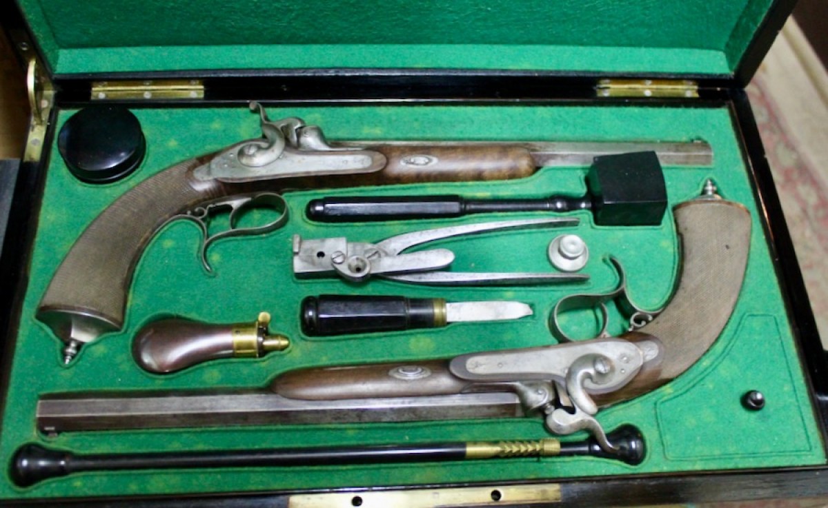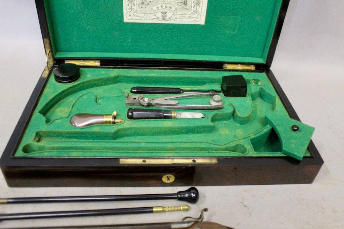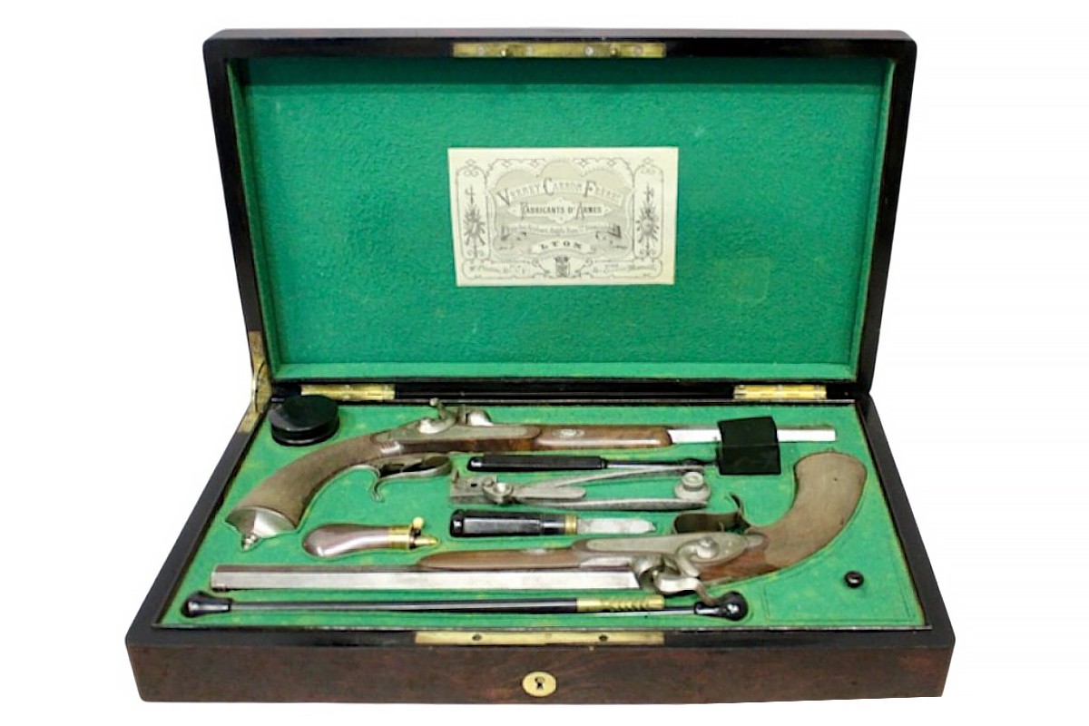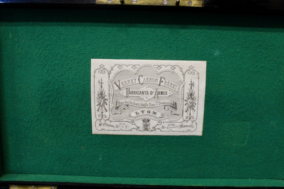 A pair of large dueling pistols, housed in their original case with numerous cleaning and reloading accessories, by Verney Carron Frères, arms manufacturers in Lyon, Saint-Étienne, and Marseille in the 19th century. The case is made of Macassar ebony with brass inlay, French polished, and lined with green velvet. The velvet is intact but has a few small stains. The case is monogrammed AG (?), and features a beautiful cutout in the center of the case's top. The case contains numerous reloading accessories: a powder measure, an ebony-mounted screwdriver, a powder flask, a nipple remover, an ebony cleaning rod, an ebony hammer, and ebony boxes. The pistols are 40 cm long. The case measures 46 cm x 28 cm x 8 cm high.