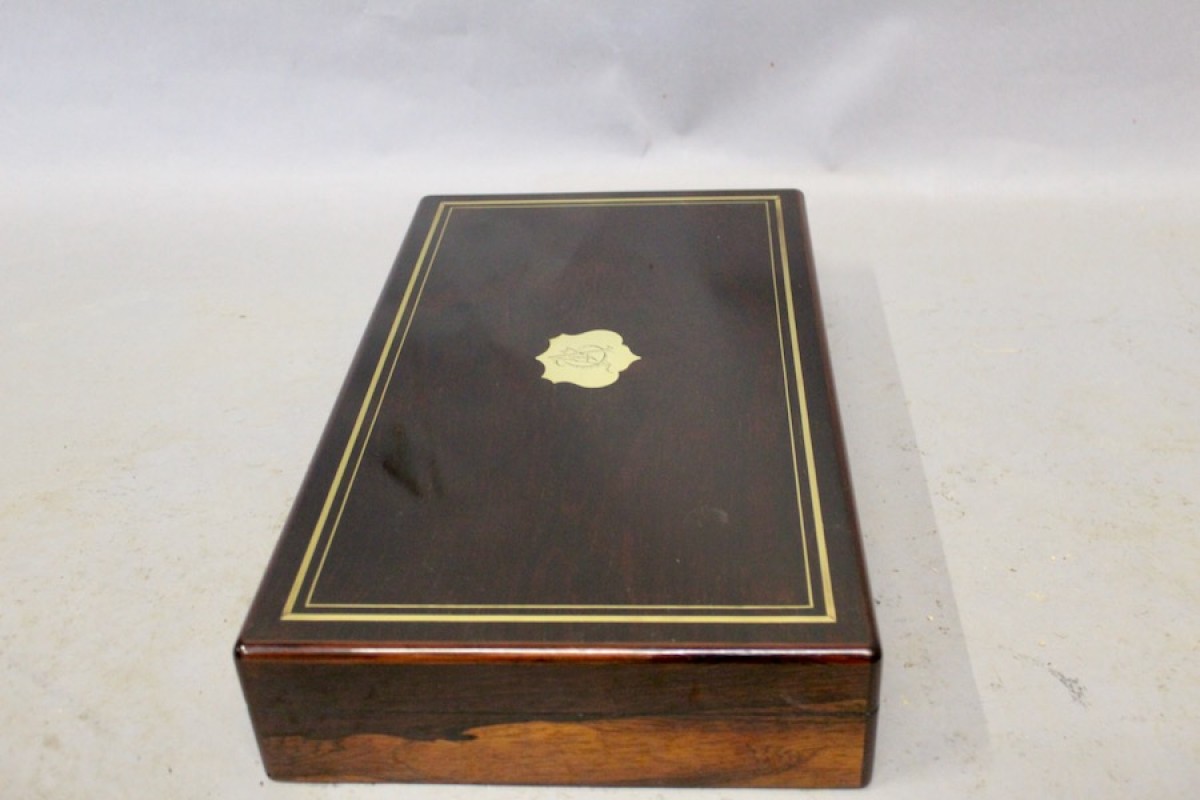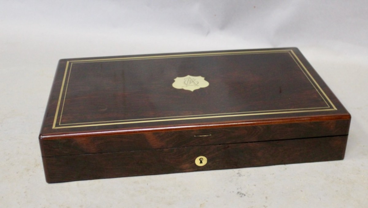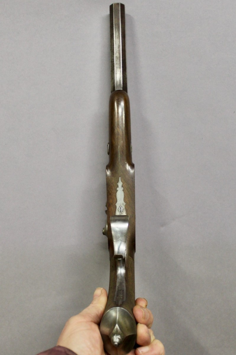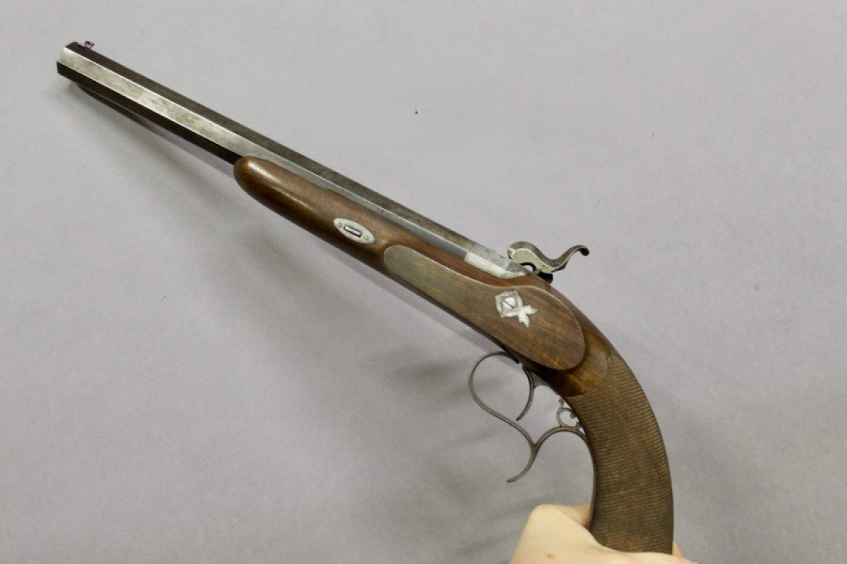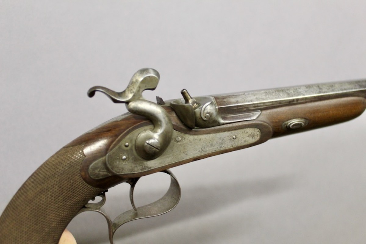 A pair of large dueling pistols, housed in their original case with numerous cleaning and reloading accessories, by Verney Carron Frères, arms manufacturers in Lyon, Saint-Étienne, and Marseille in the 19th century. The case is made of Macassar ebony with brass inlay, French polished, and lined with green velvet. The velvet is intact but has a few small stains. The case is monogrammed AG (?), and features a beautiful cutout in the center of the case's top. The case contains numerous reloading accessories: a powder measure, an ebony-mounted screwdriver, a powder flask, a nipple remover, an ebony cleaning rod, an ebony hammer, and ebony boxes. The pistols are 40 cm long. The case measures 46 cm x 28 cm x 8 cm high.