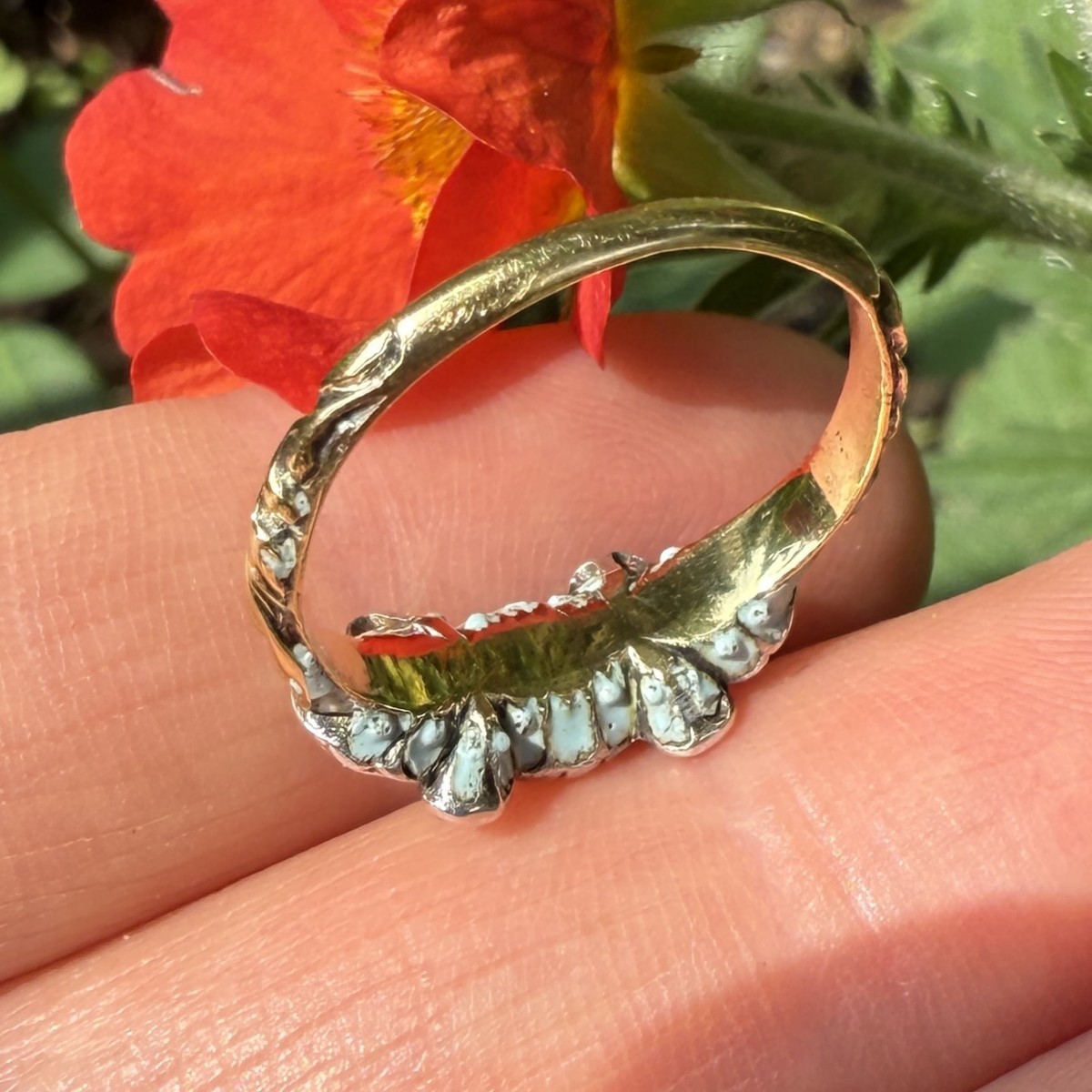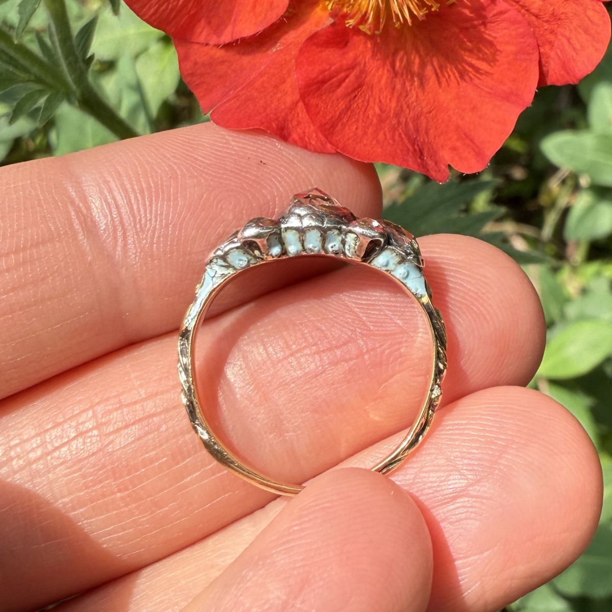 The reverse of the bezel is decorated with pale blue enamel applied within a series of recessed cells, a refinement frequently associated with high-quality English work of the late 17th century. This hidden polychromy, combined with the lightly modelled foliate motifs on the gold shank, reflects the ornamental vocabulary of the Baroque period and the meticulous finishing expected of fine jewellery of this date.