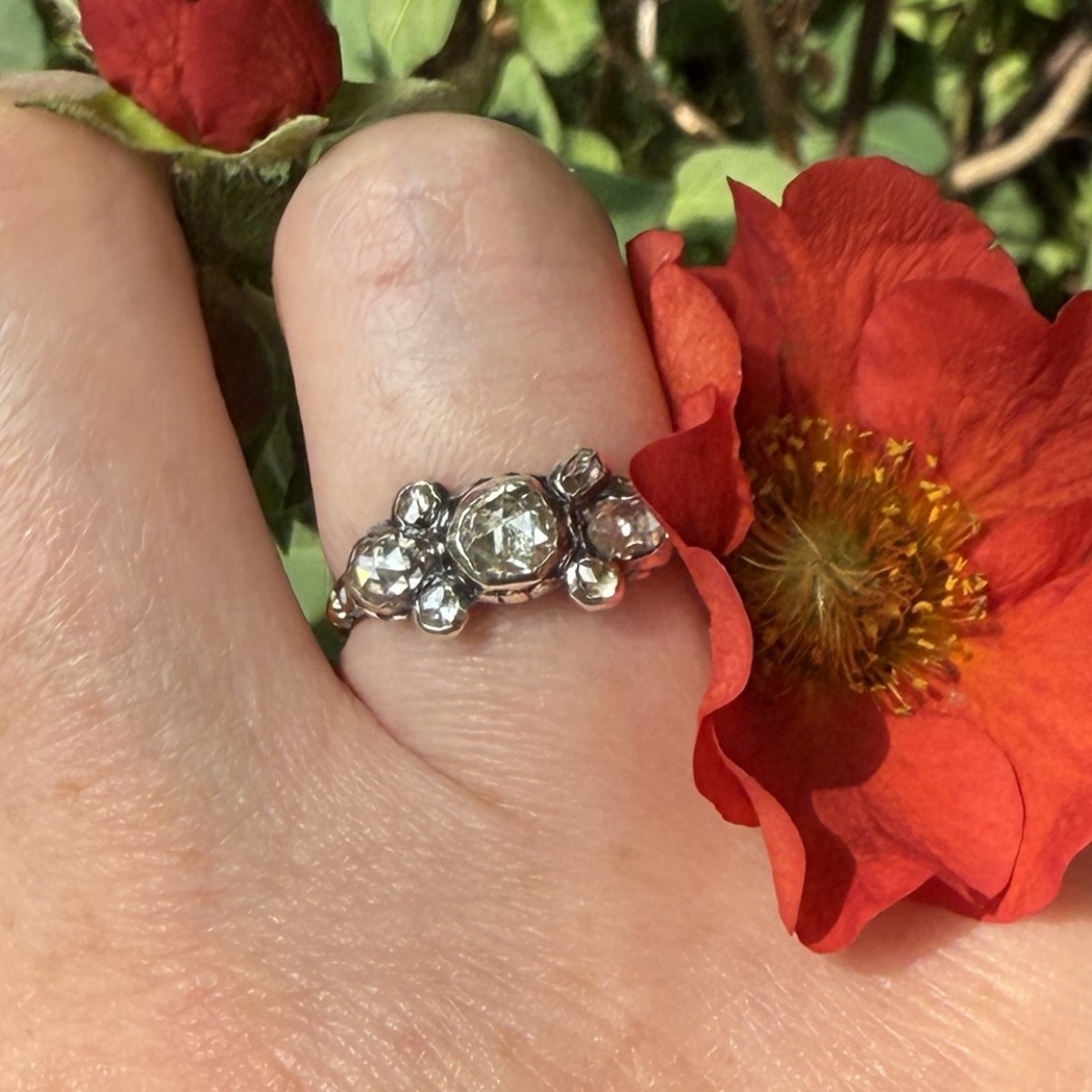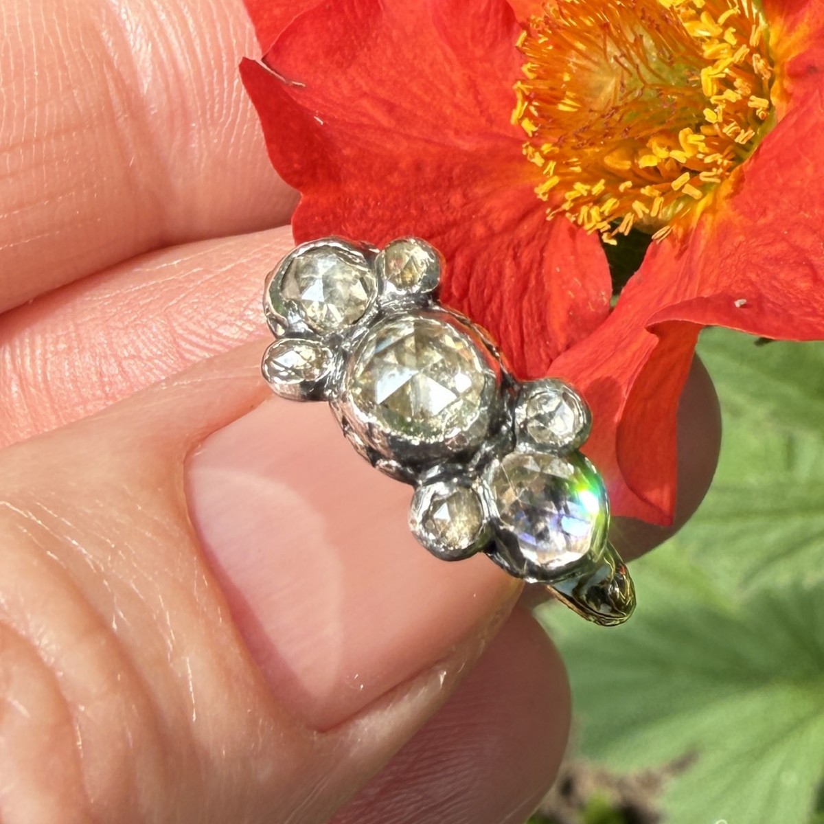 An English late 17th-century ring in high-carat gold, its bezel formed of a graduated arrangement of rose-cut diamonds set in closed, silver mounts. The central stone is framed by smaller rose-cut diamonds arranged in a composite formation characteristic of English cluster settings in the later Stuart period. The use of silver over gold follows established practice intended to heighten the reflective quality of the diamonds while maintaining the intrinsic richness of the underlying gold.