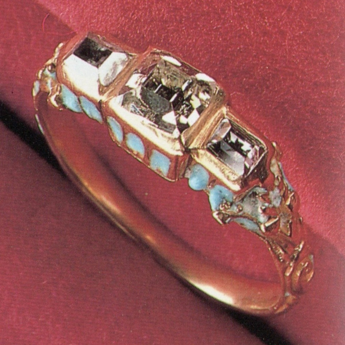Examples with similar shanks and blue enamel can be found in The Power of Love: Six centuries of diamond betrothal rings, page 16, figs. A & B.