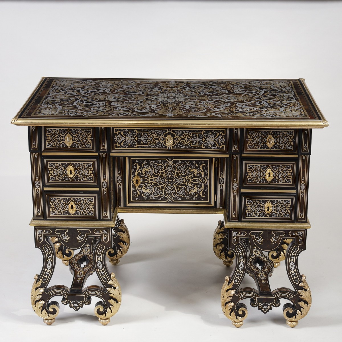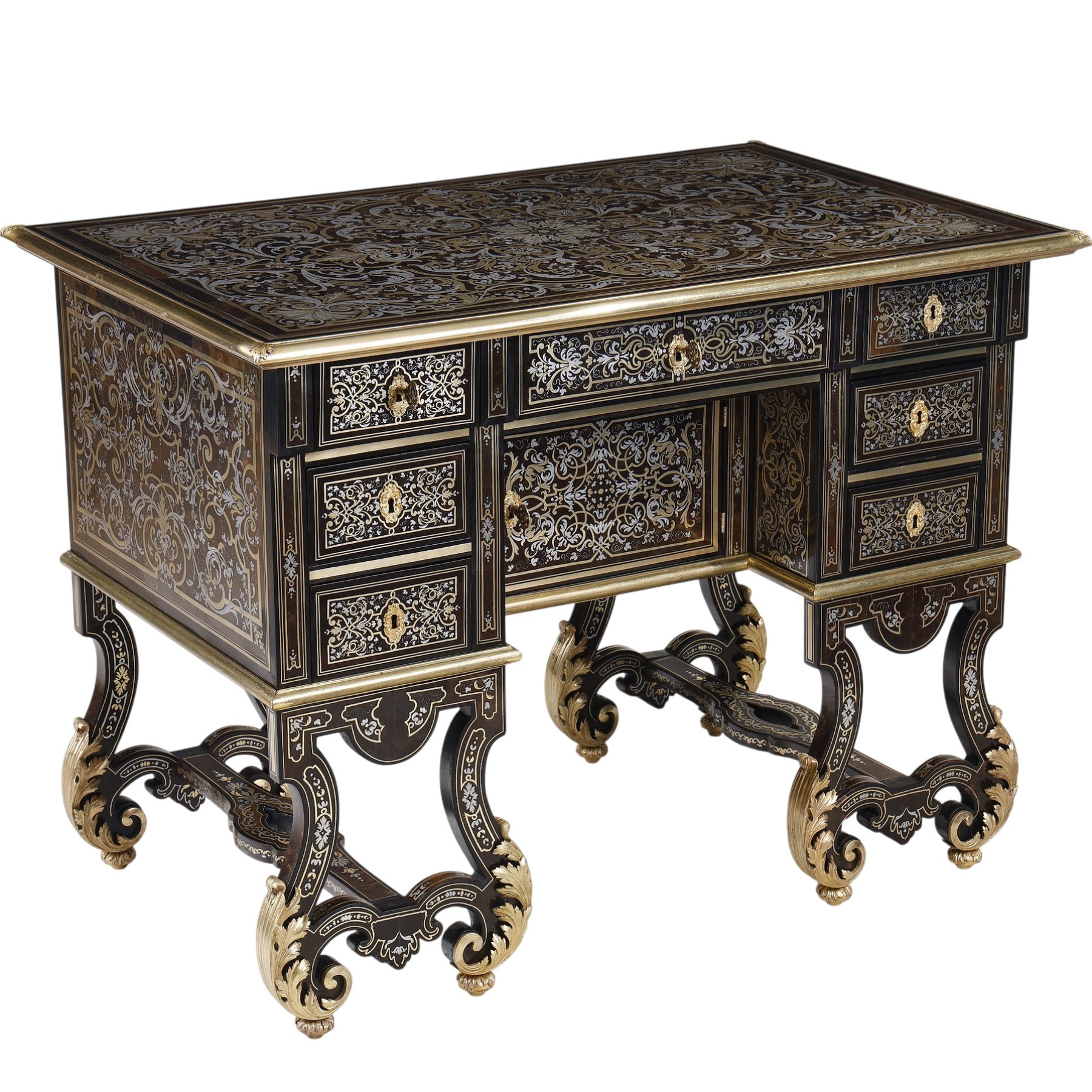 One such example, a desk quite similar to ours but with a somewhat less refined finish, is attributed to Alexandre-Jean Oppenordt and belongs to the Wallace collection.