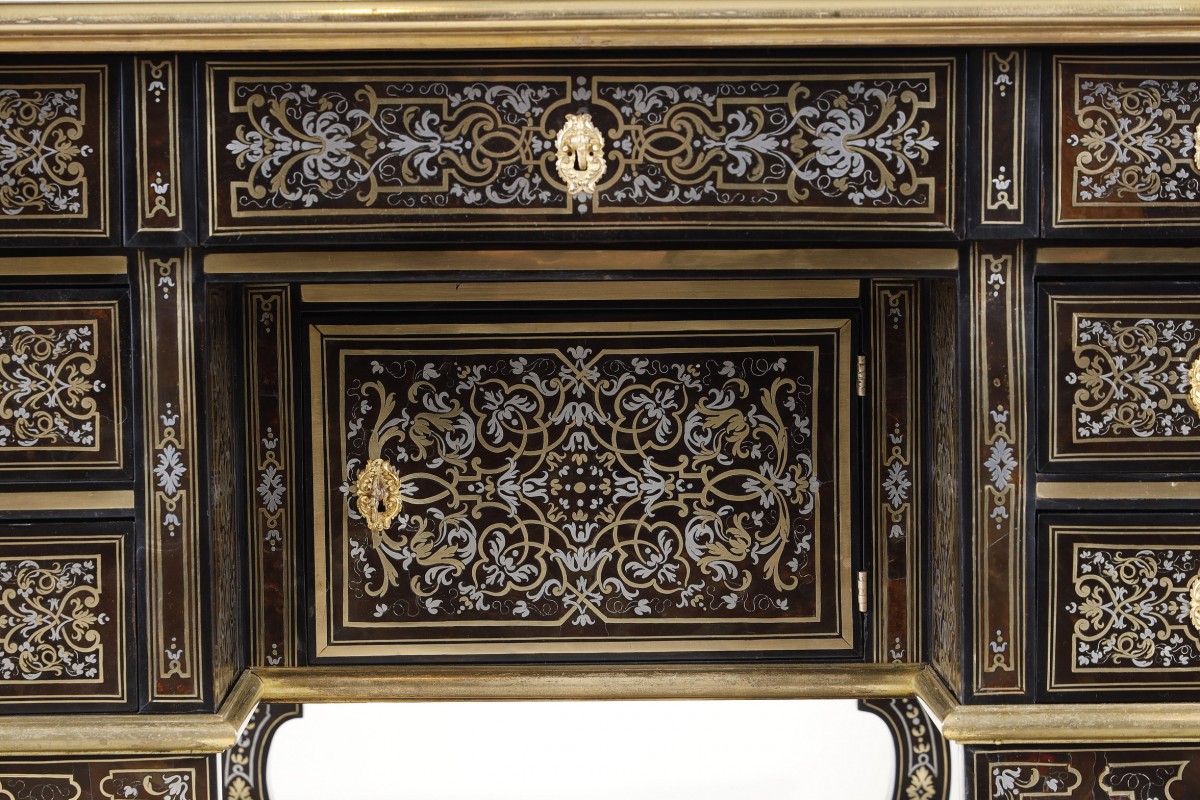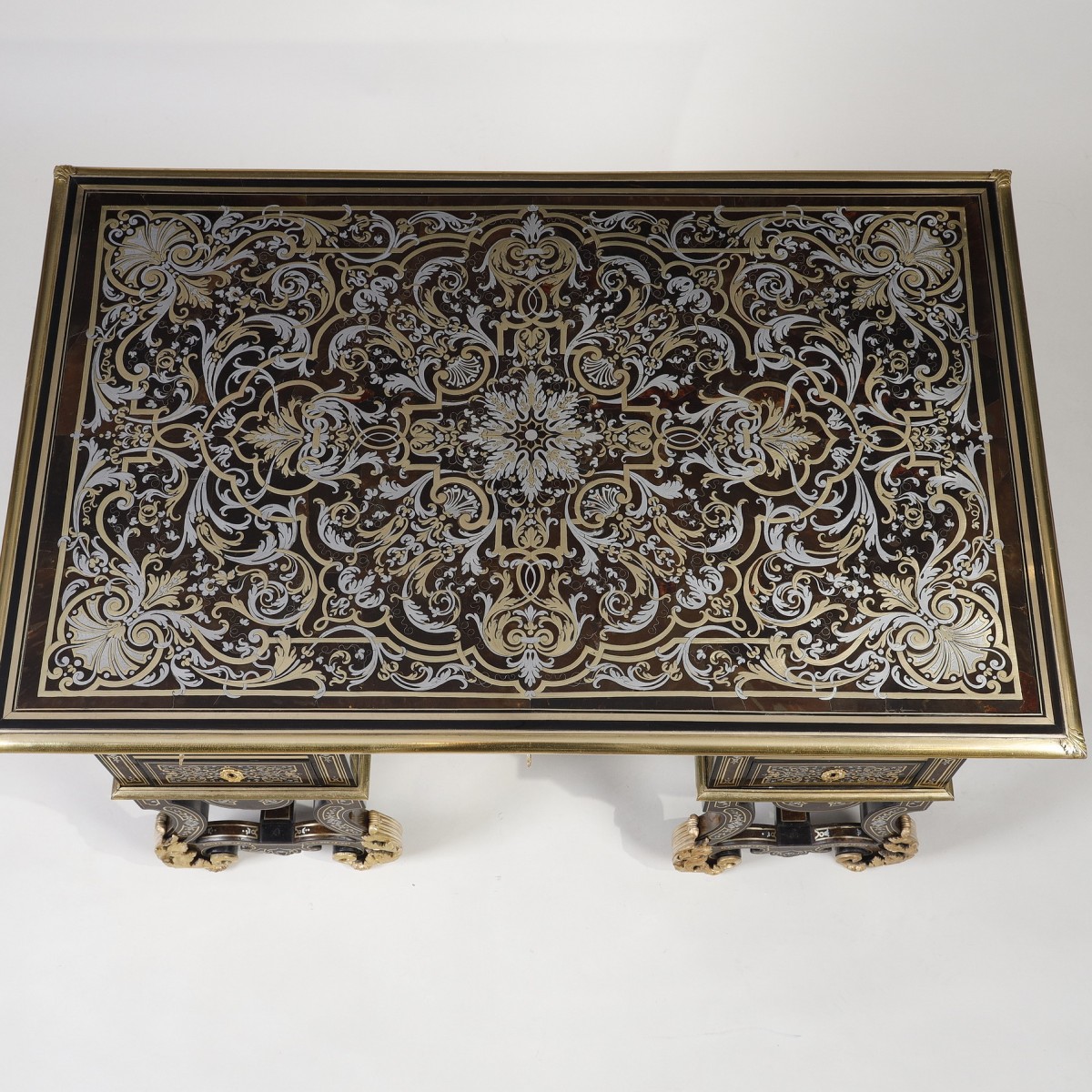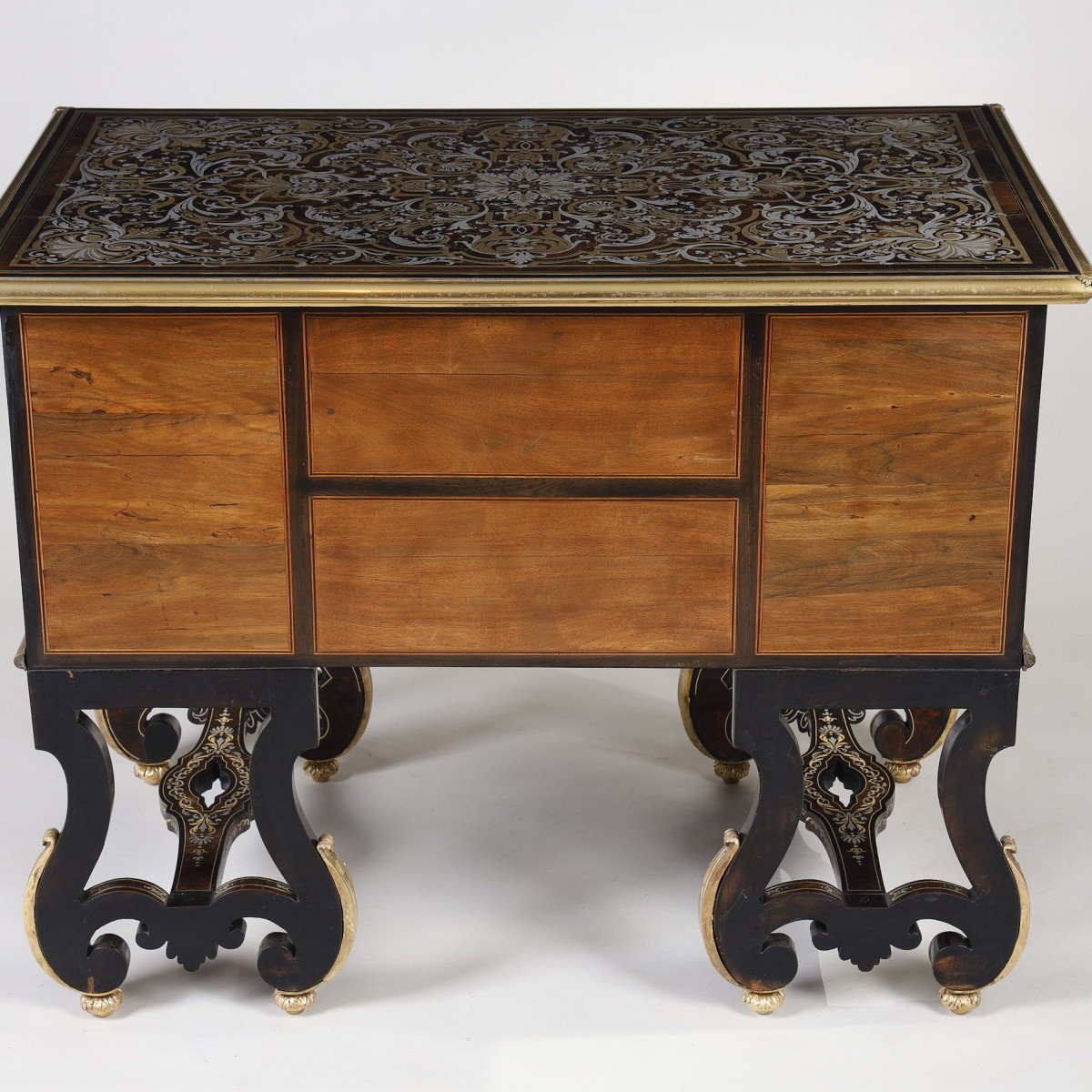 This small desk is adorned with dense Boulle marquetry in the front section, in brass and pewter on a brown tortoiseshell ground.