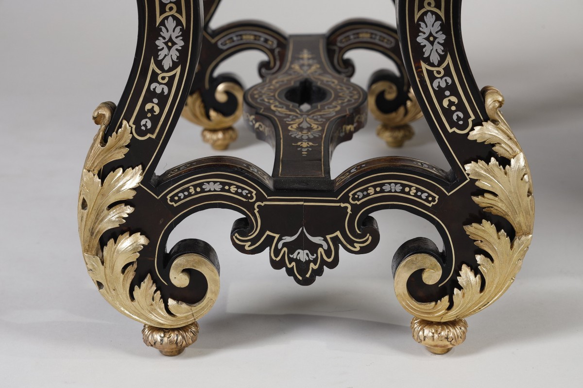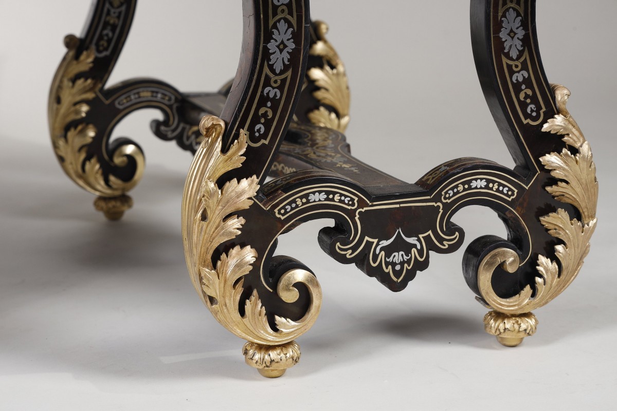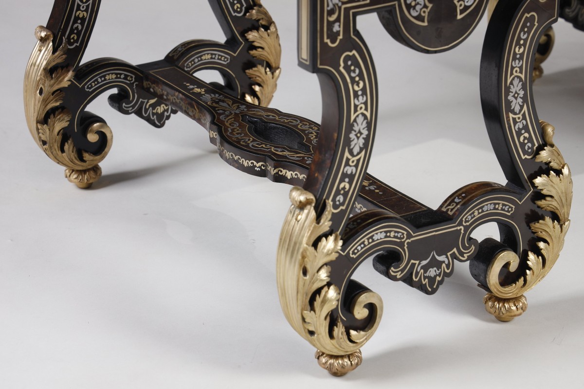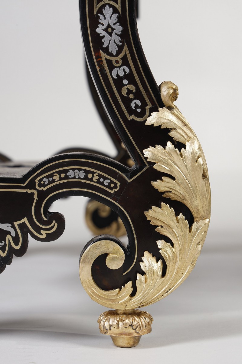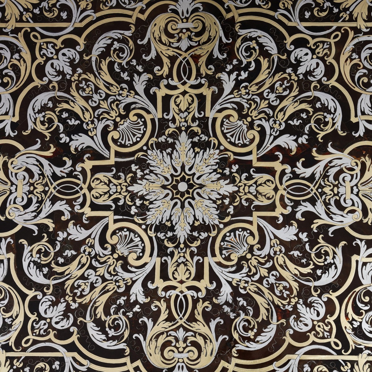 The top, encircled by a molding, features a rich decoration of interlacing brass and pewter against a brown tortoiseshell background. This perfectly symmetrical and fluid decoration also testifies to a very high-quality production.