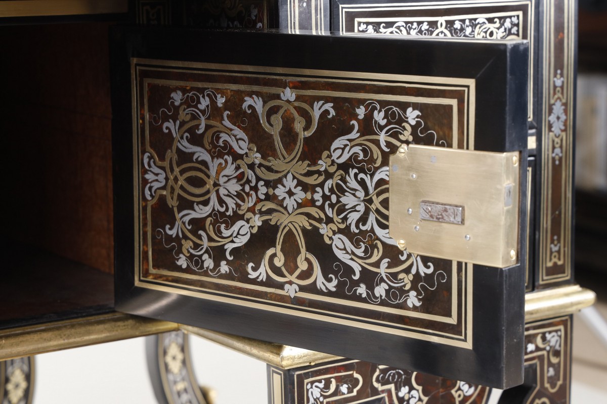 A second example, with a somewhat similar base, is nevertheless joined by a full stretcher and has an uninlaid drawer front; it comes from the Steinitz collection. This is a cabinet desk attributed to André Charles Boulle, presented at the 2010 Biennale.