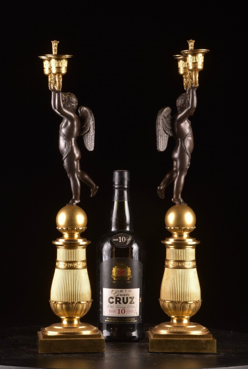 Pair of patinated and gilt bronze two-light candelabra from the Charles X period (circa 1824–1830).