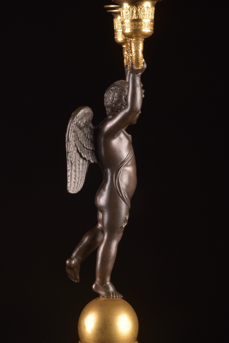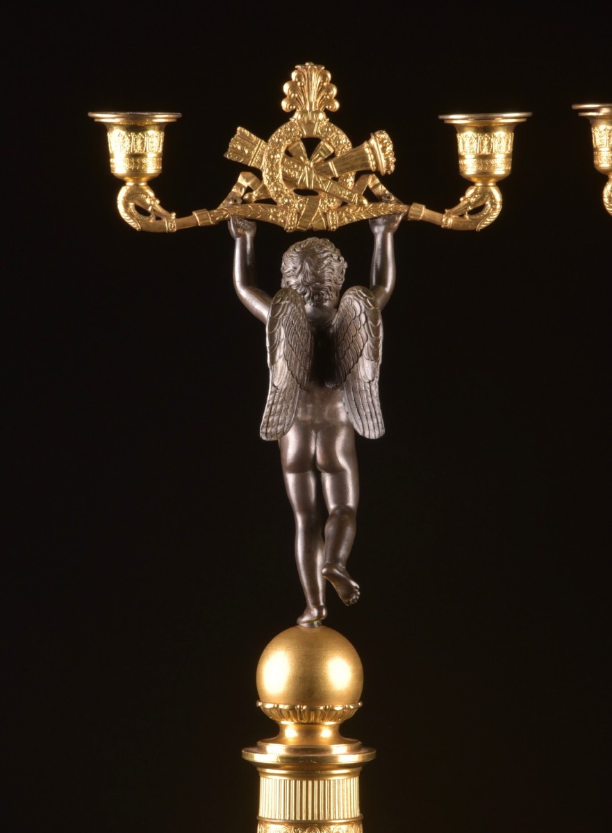 The candle arms are supported by cherubs cast in dark patinated bronze, creating an elegant contrast with the richly fire-gilded decorative elements. The upper section is centred around a laurel wreath with crossed attributes and an acanthus crest, reflecting the refined neoclassical vocabulary characteristic of the late Bourbon style.