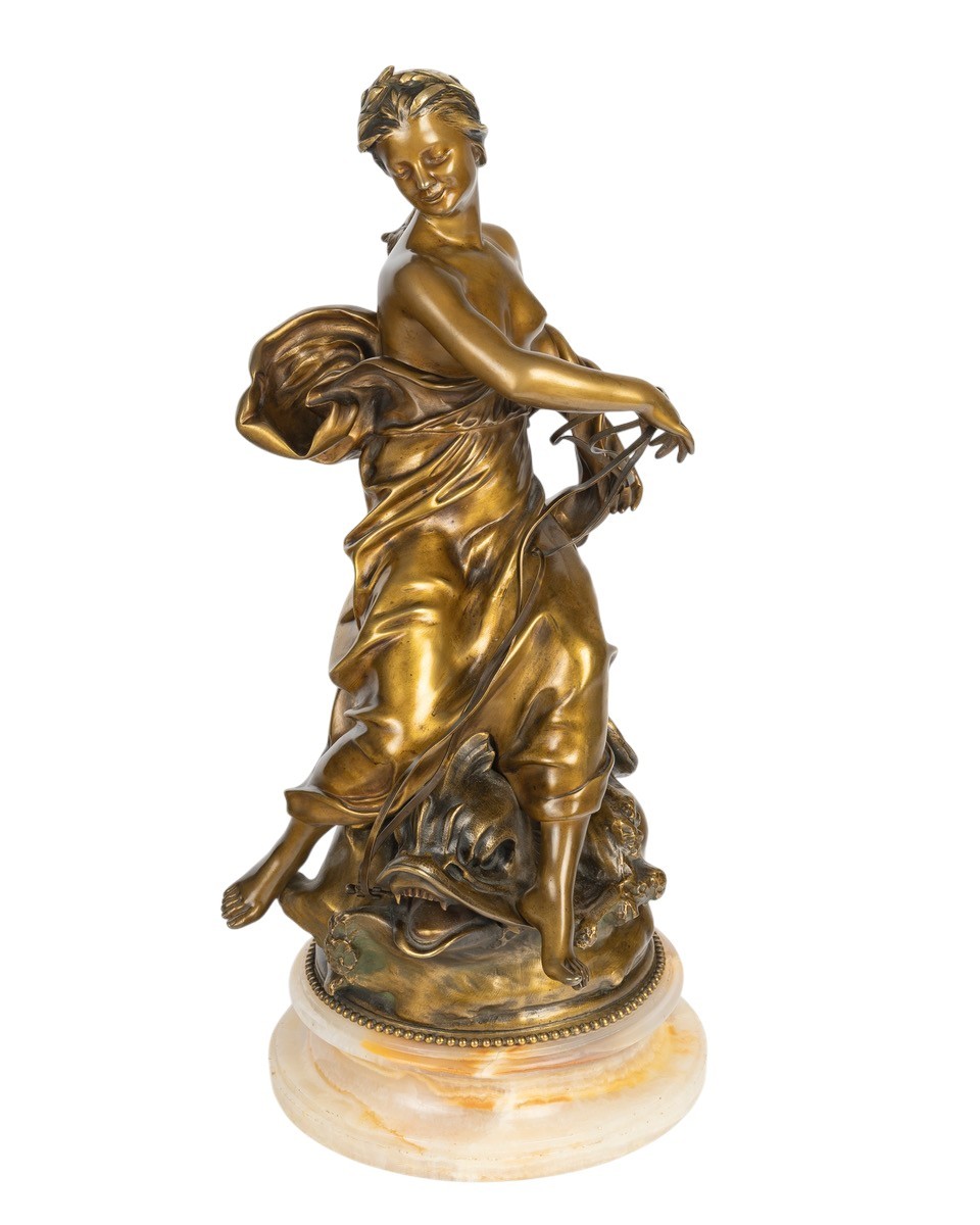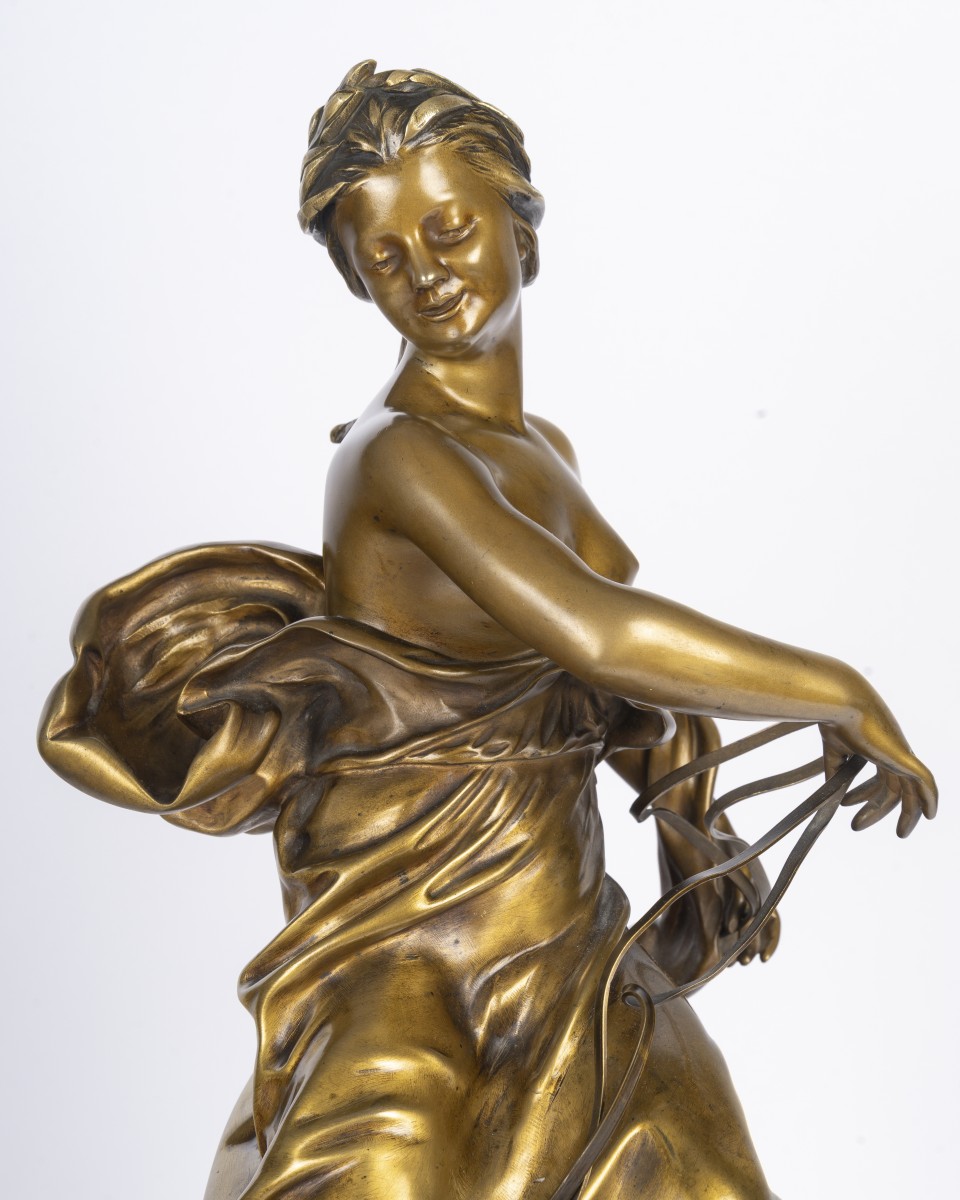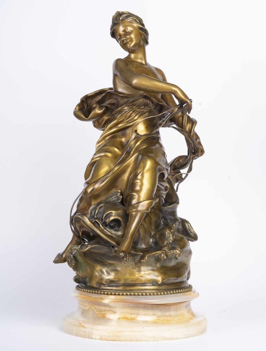 The gilding of the bronze beautifully captures the light, making the reliefs of the drapery and waves shimmer. The sculpture rests on an elegant onyx base, which enhances the whole and underscores its decorative character.
