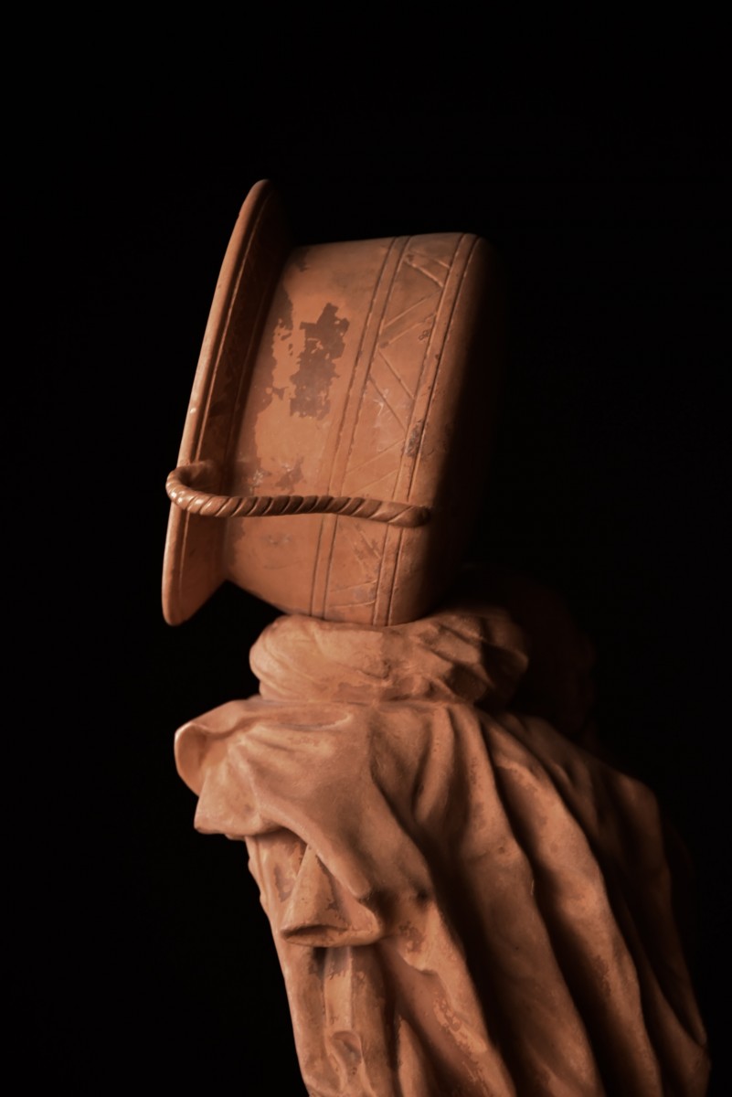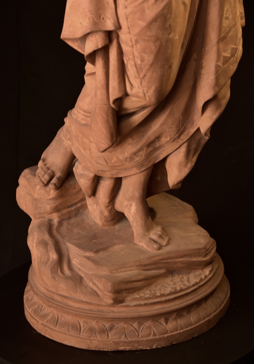 With its impressive height of 140 cm, this sculpture has a strong, almost museum-like presence. The warm terracotta tone enhances its expressive depth and decorative appeal.