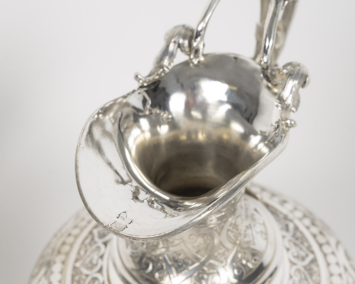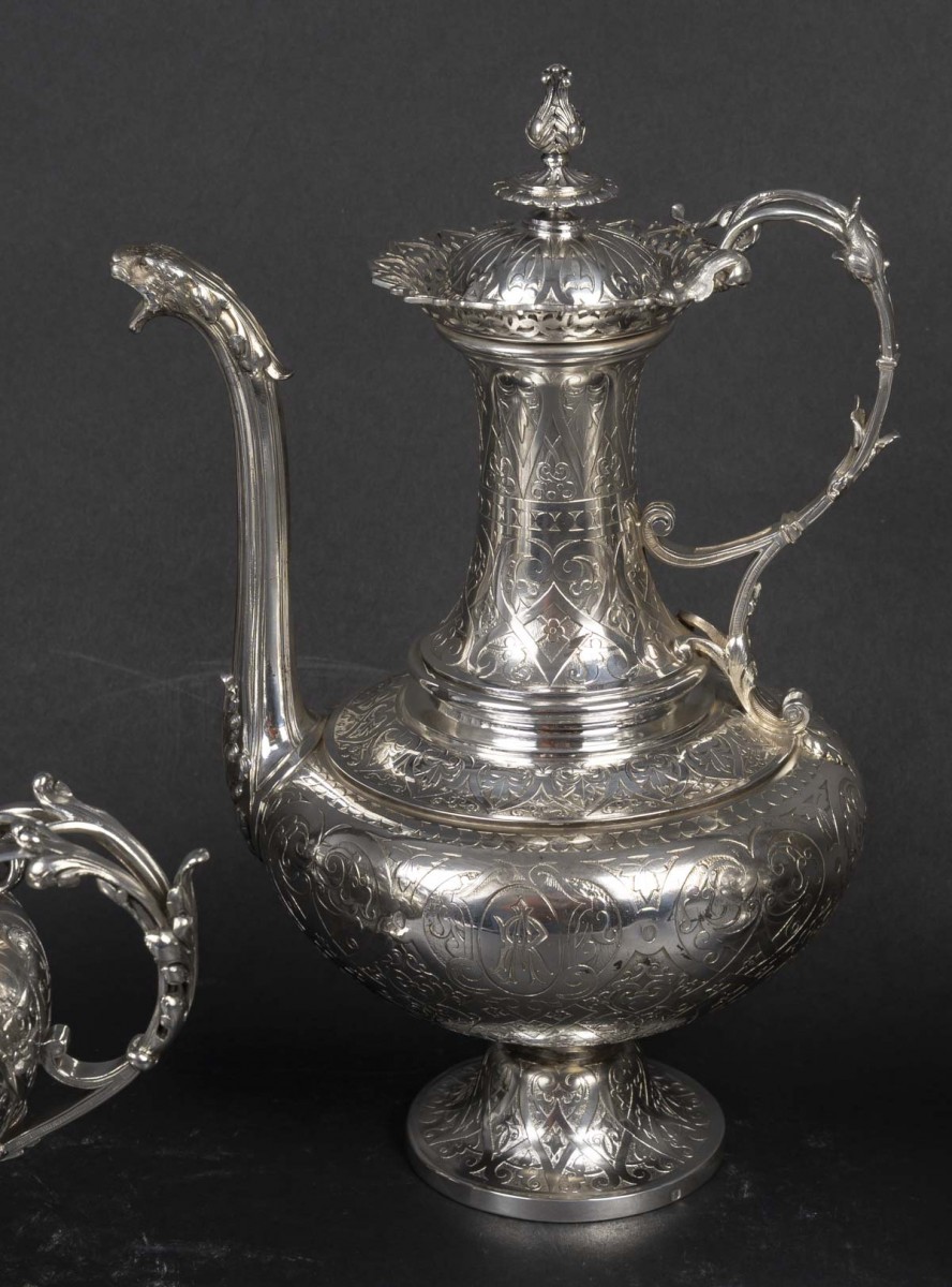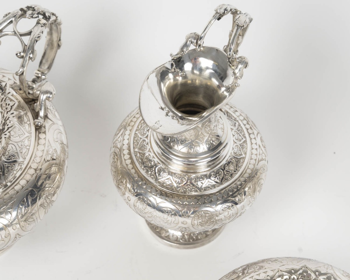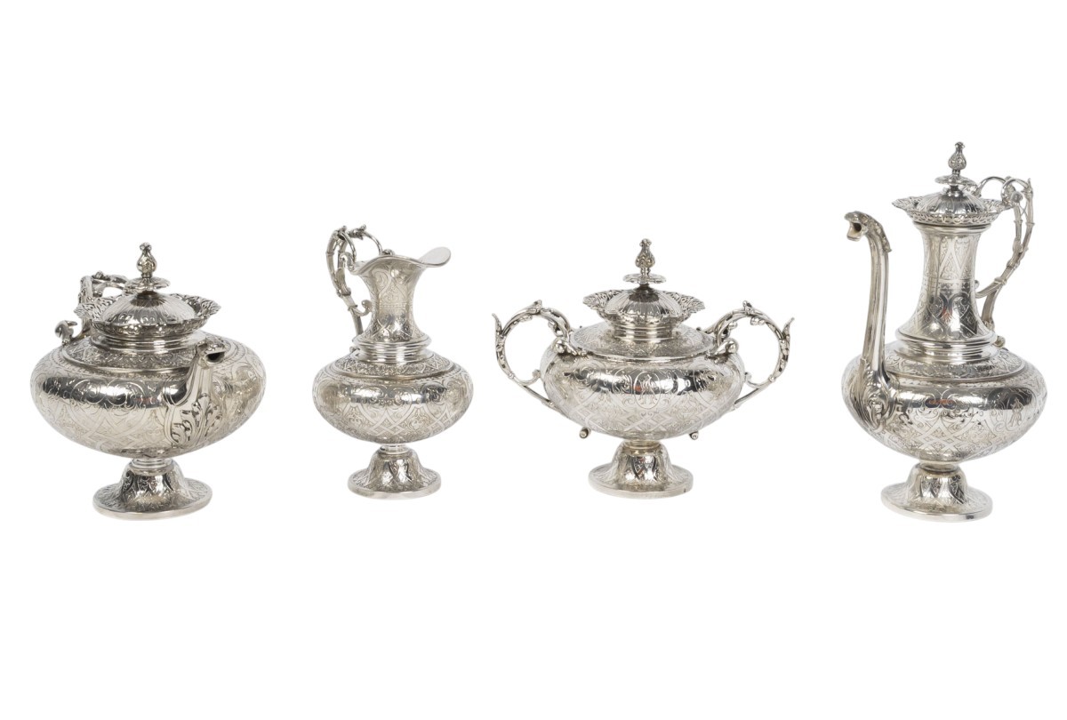A magnificent solid silver service, typical of the Neo-Renaissance style developed by Froment-Meurice. Each piece, mounted on a pedestal, features a richly decorated repoussé and chased design: scrolls, cartouches, foliage, masks, and zoomorphic motifs, particularly on the handles and spouts, sculpted in the style of fantastical or naturalistic creatures.