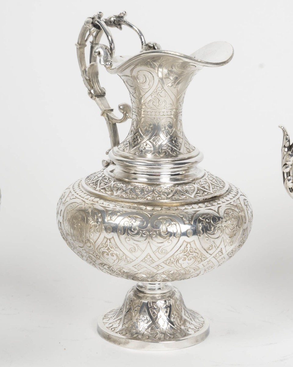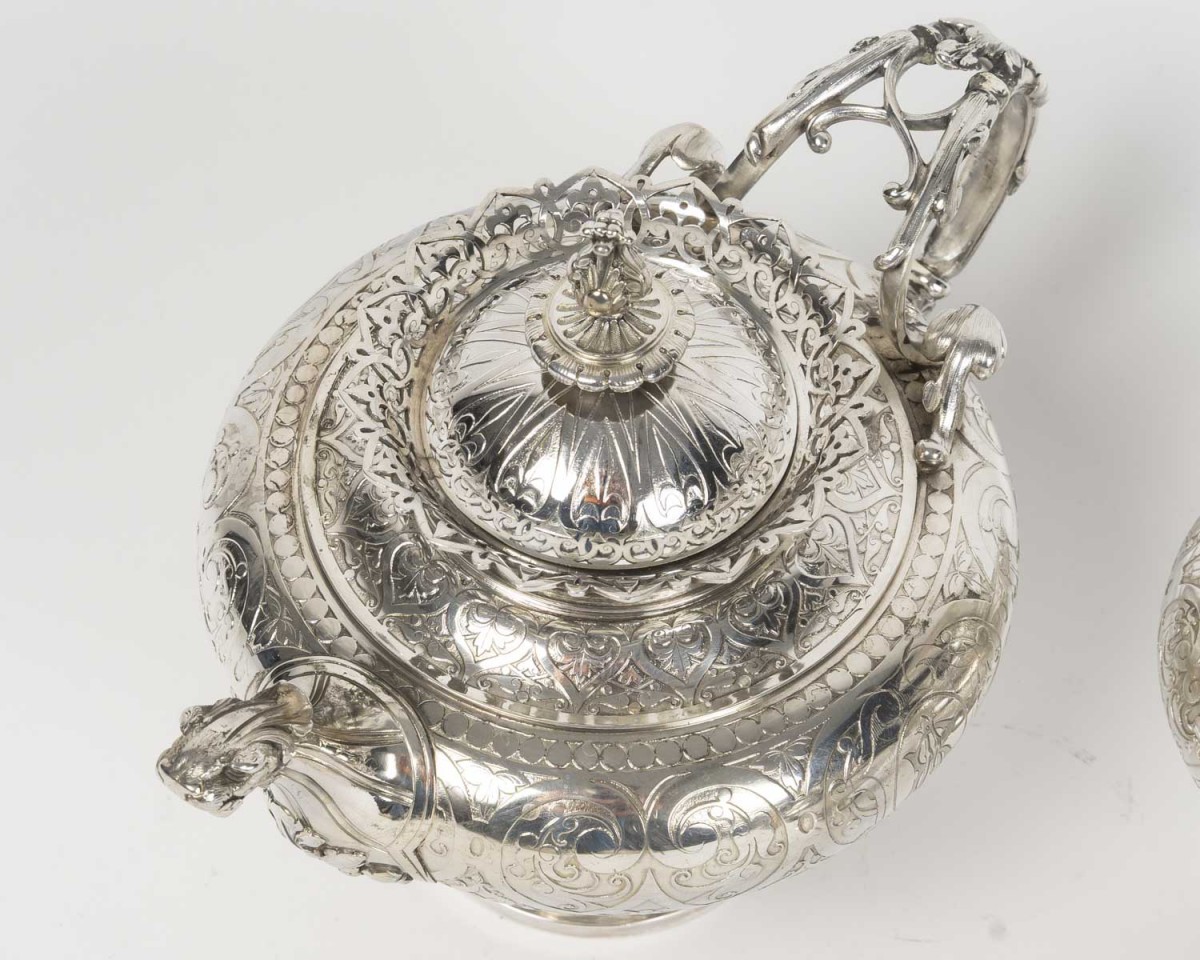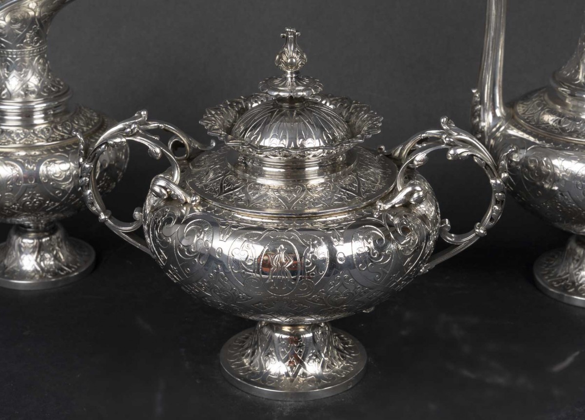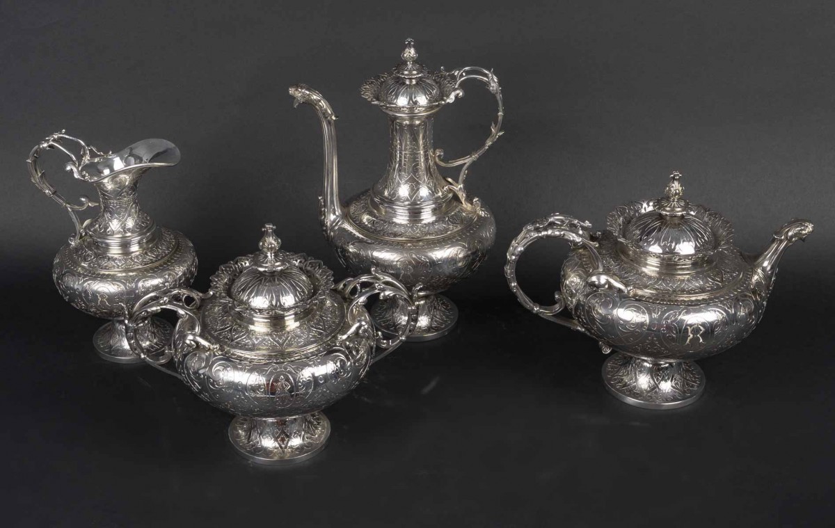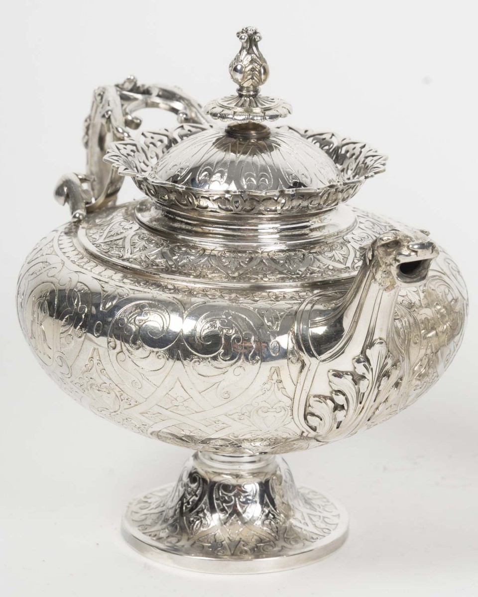 A magnificent solid silver service, typical of the Neo-Renaissance style developed by Froment-Meurice. Each piece, mounted on a pedestal, features a richly decorated repoussé and chased design: scrolls, cartouches, foliage, masks, and zoomorphic motifs, particularly on the handles and spouts, sculpted in the style of fantastical or naturalistic creatures.
