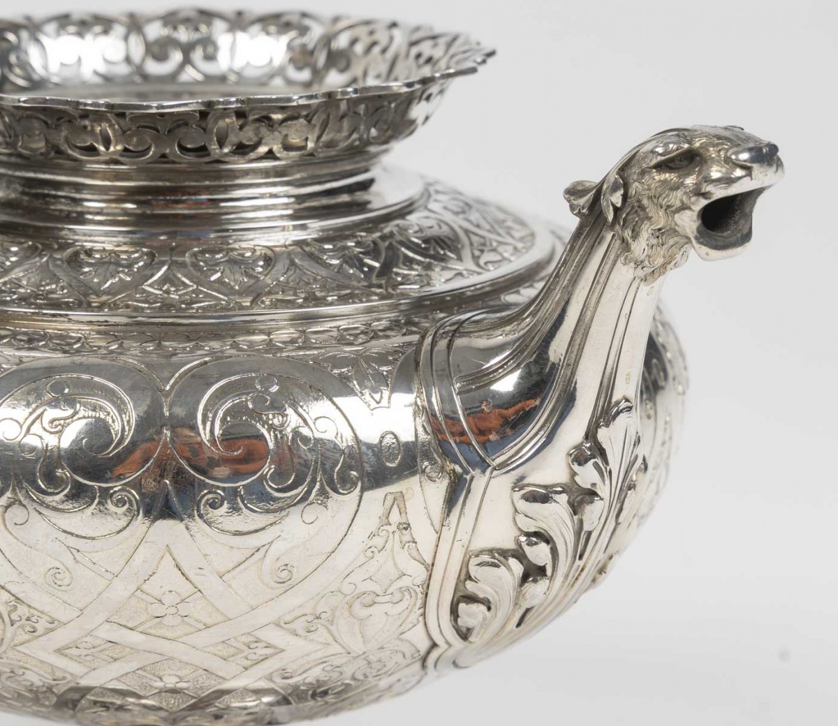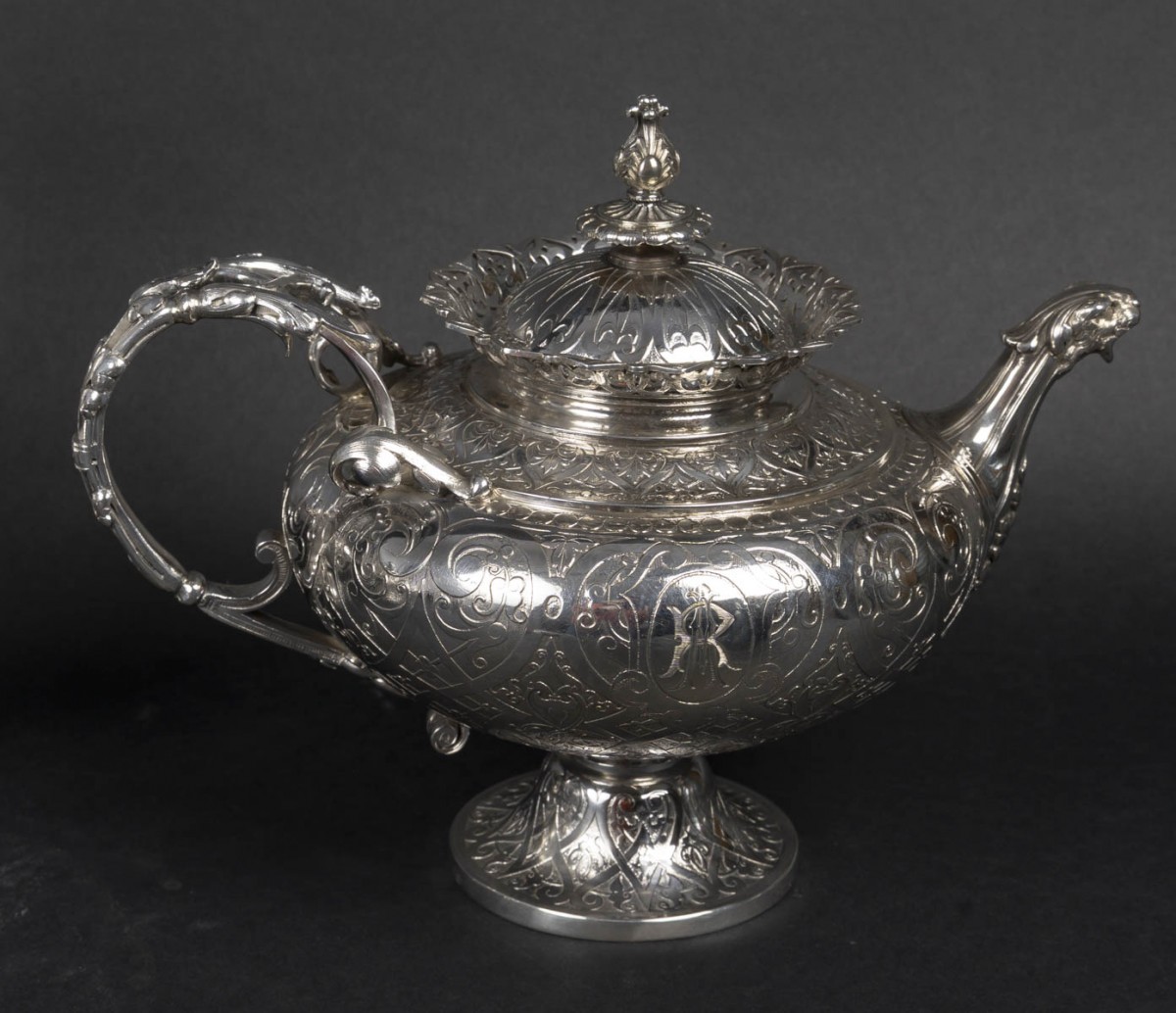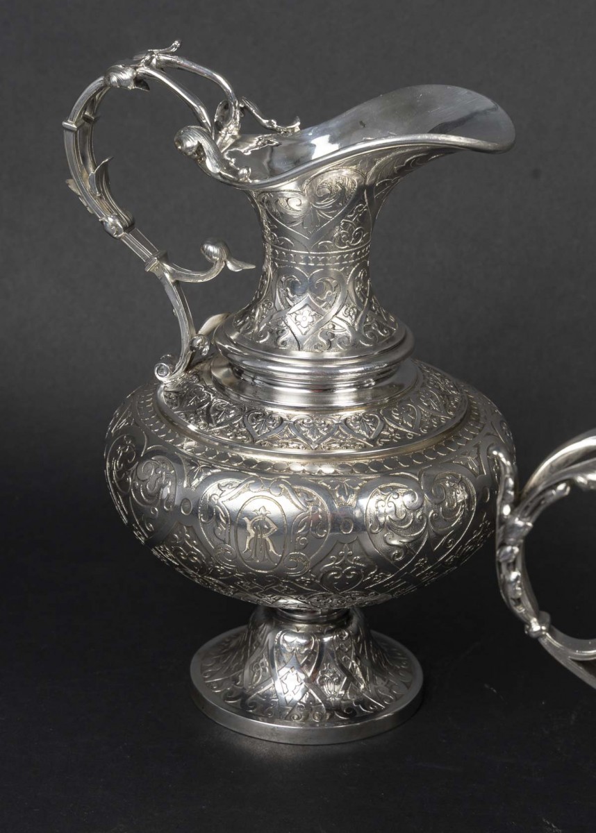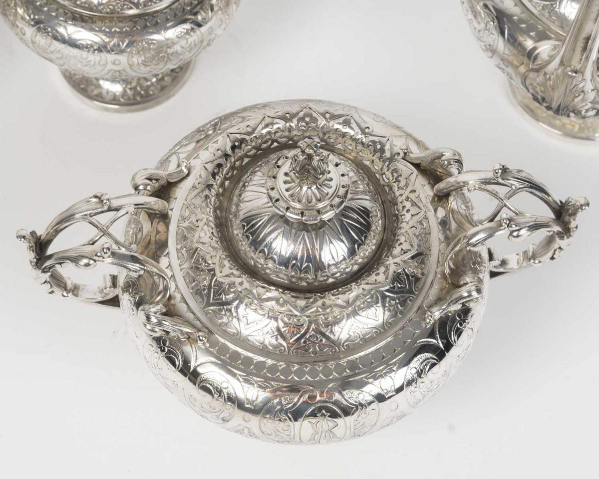A magnificent solid silver service, typical of the Neo-Renaissance style developed by Froment-Meurice. Each piece, mounted on a pedestal, features a richly decorated repoussé and chased design: scrolls, cartouches, foliage, masks, and zoomorphic motifs, particularly on the handles and spouts, sculpted in the style of fantastical or naturalistic creatures.