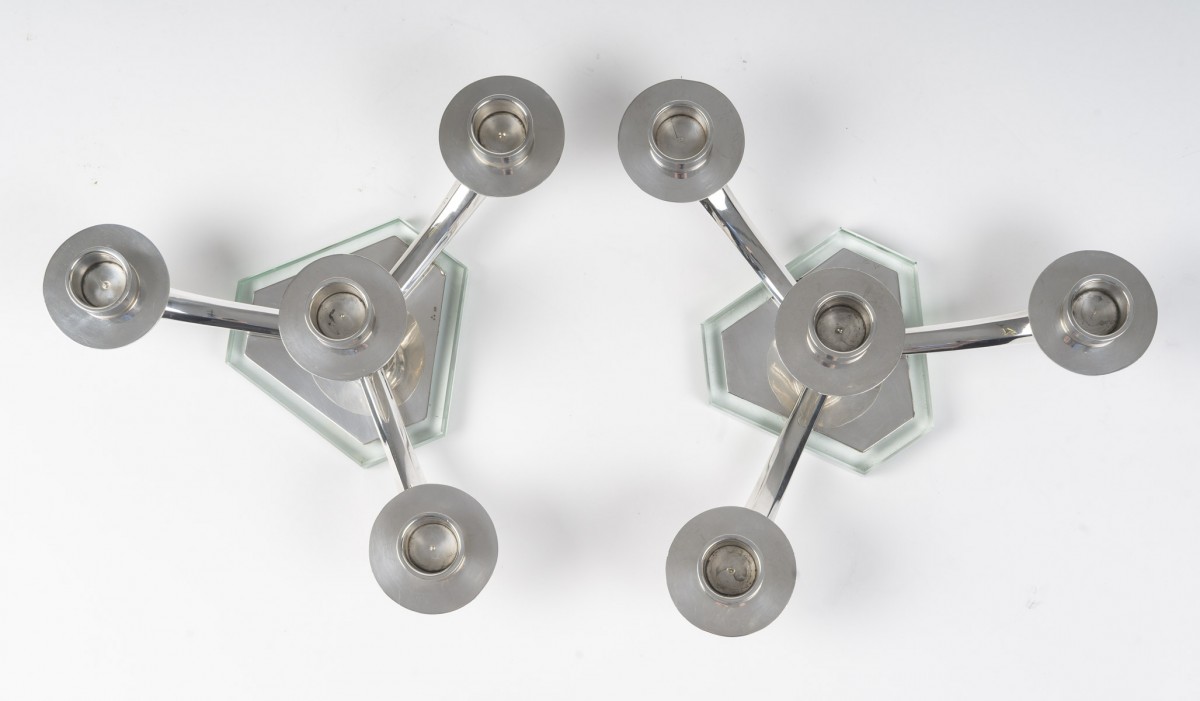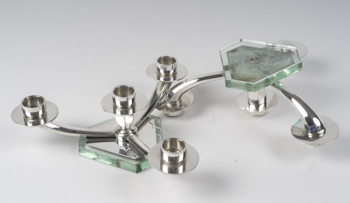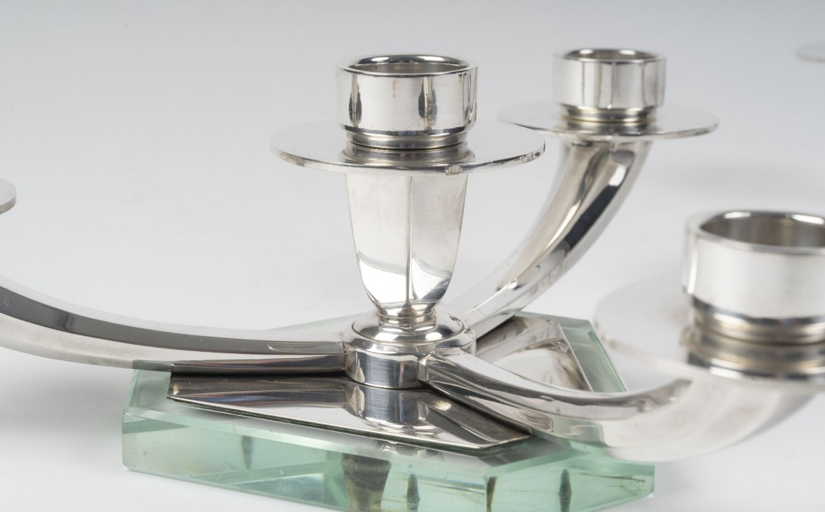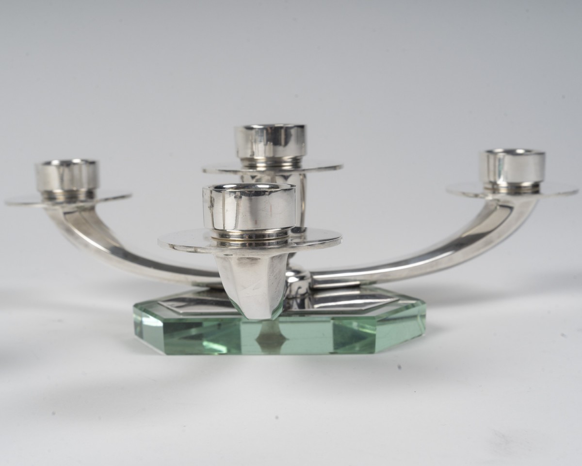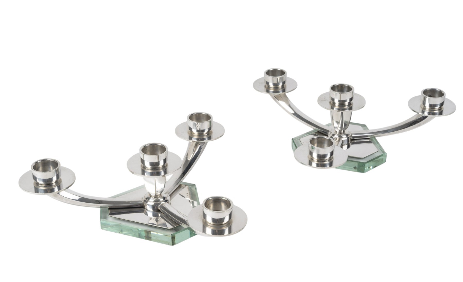 An elegant pair of low solid silver candelabra, each composed of three arched arms rising from a central stem surmounted by a fourth light. The perfectly polished circular candle cups create a subtle play of light and delicately reflect their surroundings. The base, consisting of a geometric glass plinth with slightly greenish reflections, lends the ensemble a contemporary touch and a great visual lightness.