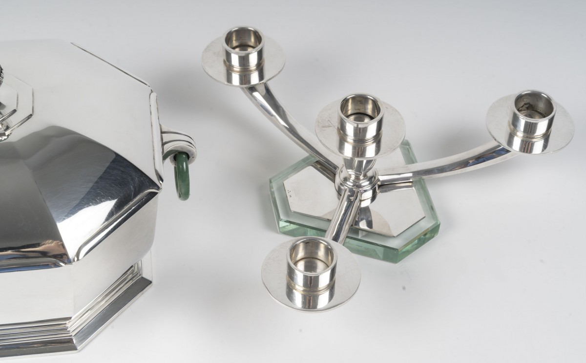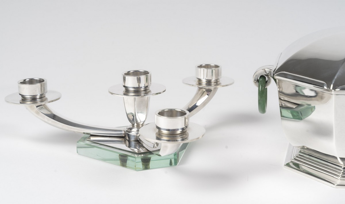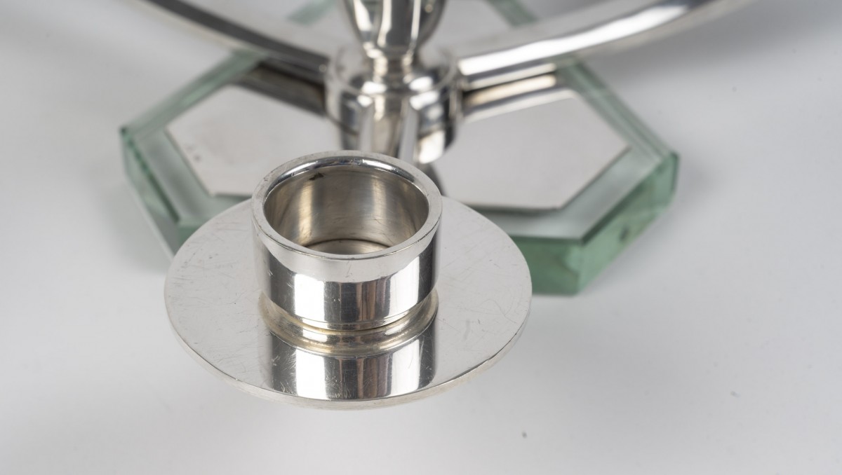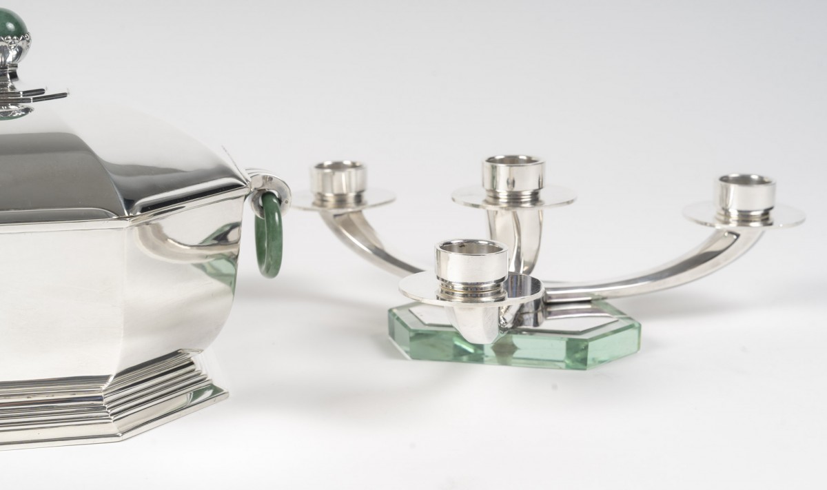 The contrast between the gleaming metal and the transparency of the glass particularly highlights the precision of the lines and the silversmith's craftsmanship. The whole piece exudes harmony, balance, and masterful craftsmanship.