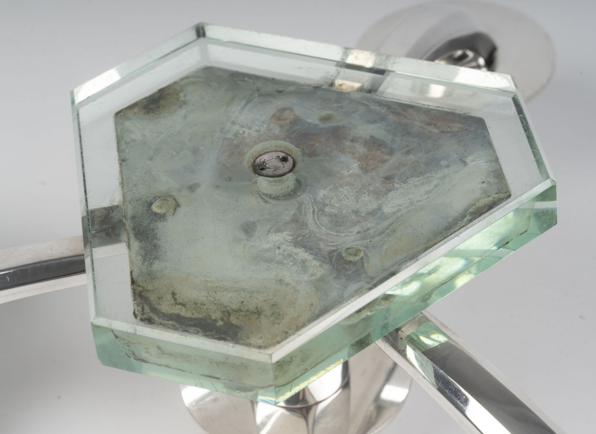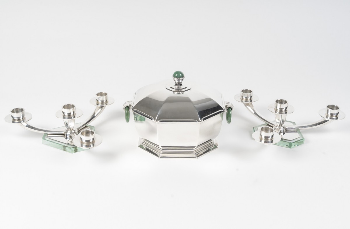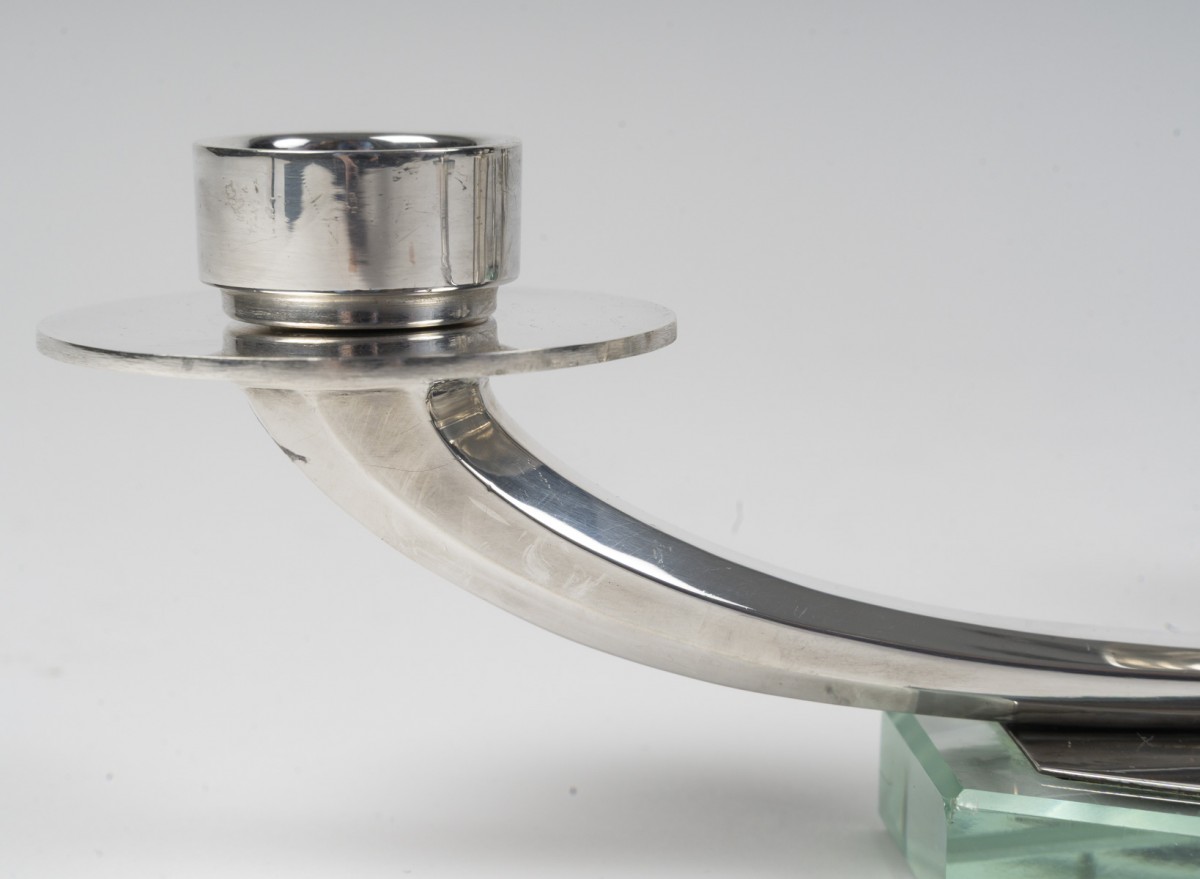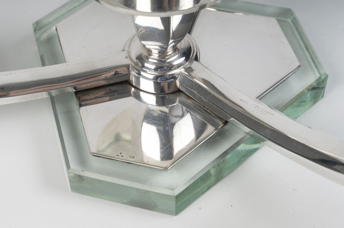 The contrast between the gleaming metal and the transparency of the glass particularly highlights the precision of the lines and the silversmith's craftsmanship. The whole piece exudes harmony, balance, and masterful craftsmanship.