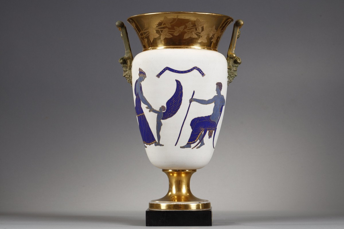 Large Biscuit and glazed porcelain vase, decorated on each side of the body with Antique Greek scenes in cobalt blue and gold on a white ground. The neck and spreading foot are entirely gilded. The biscuit handles depict bearded male heads crowned with flowers, finished in a green patina and gold to imitate antique bronze. The vase is mounted on a square black marble base.